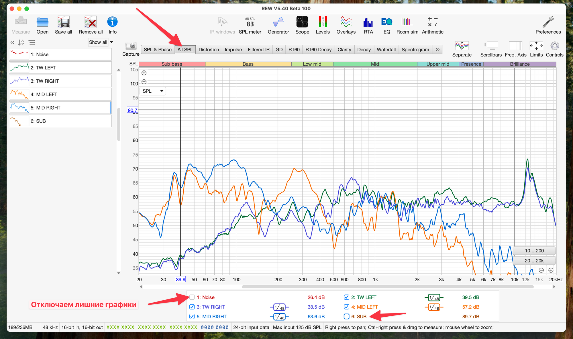 Для того чтобы посмотреть все или отдельные графики в одном окне, то выбираем вкладку "All SPL", при этом каждый график можно временно включить и отключить из текущего вида: