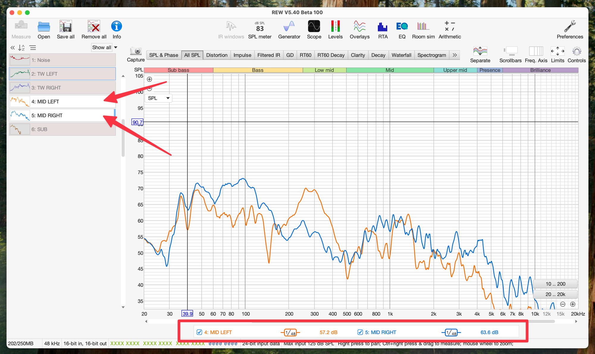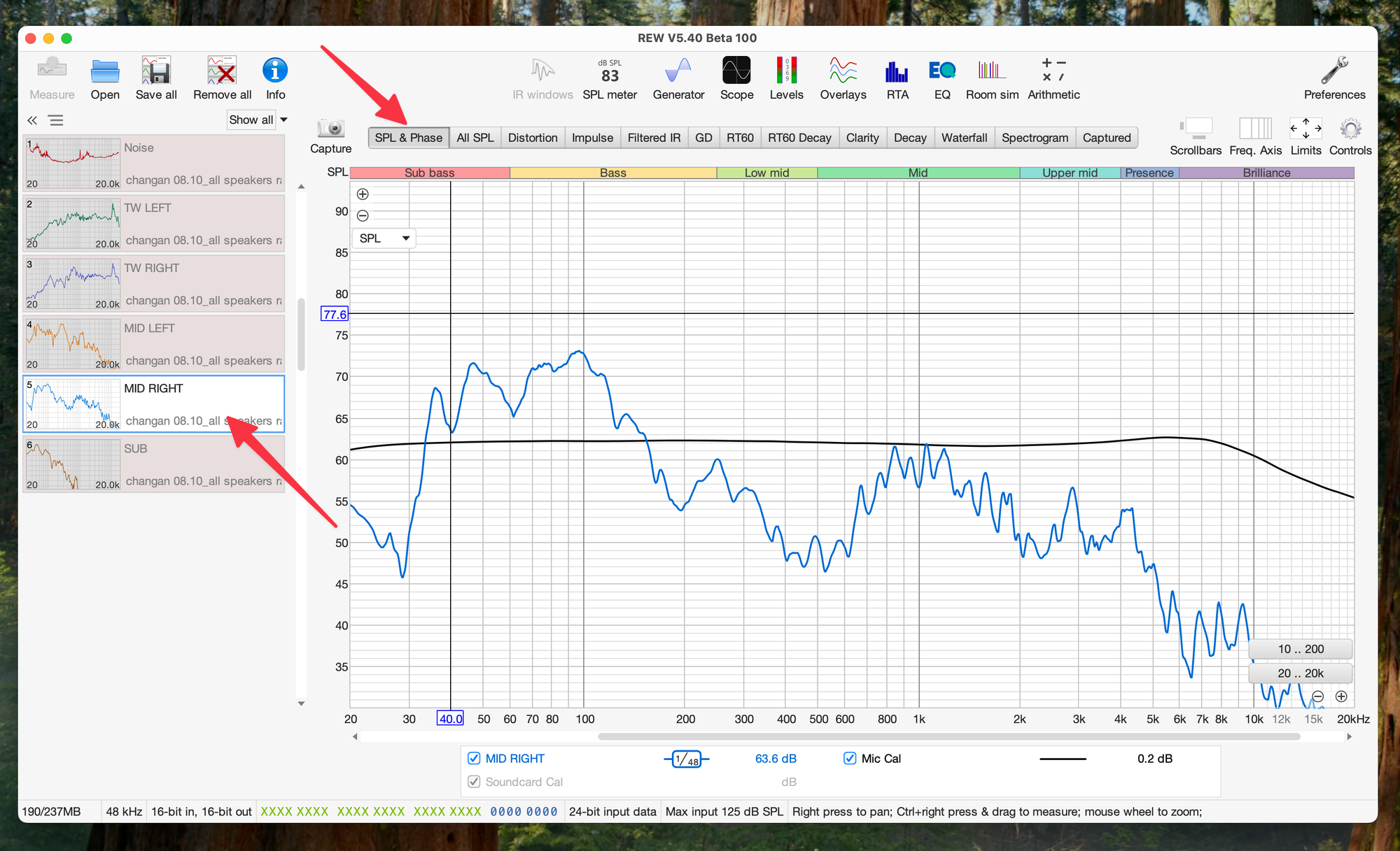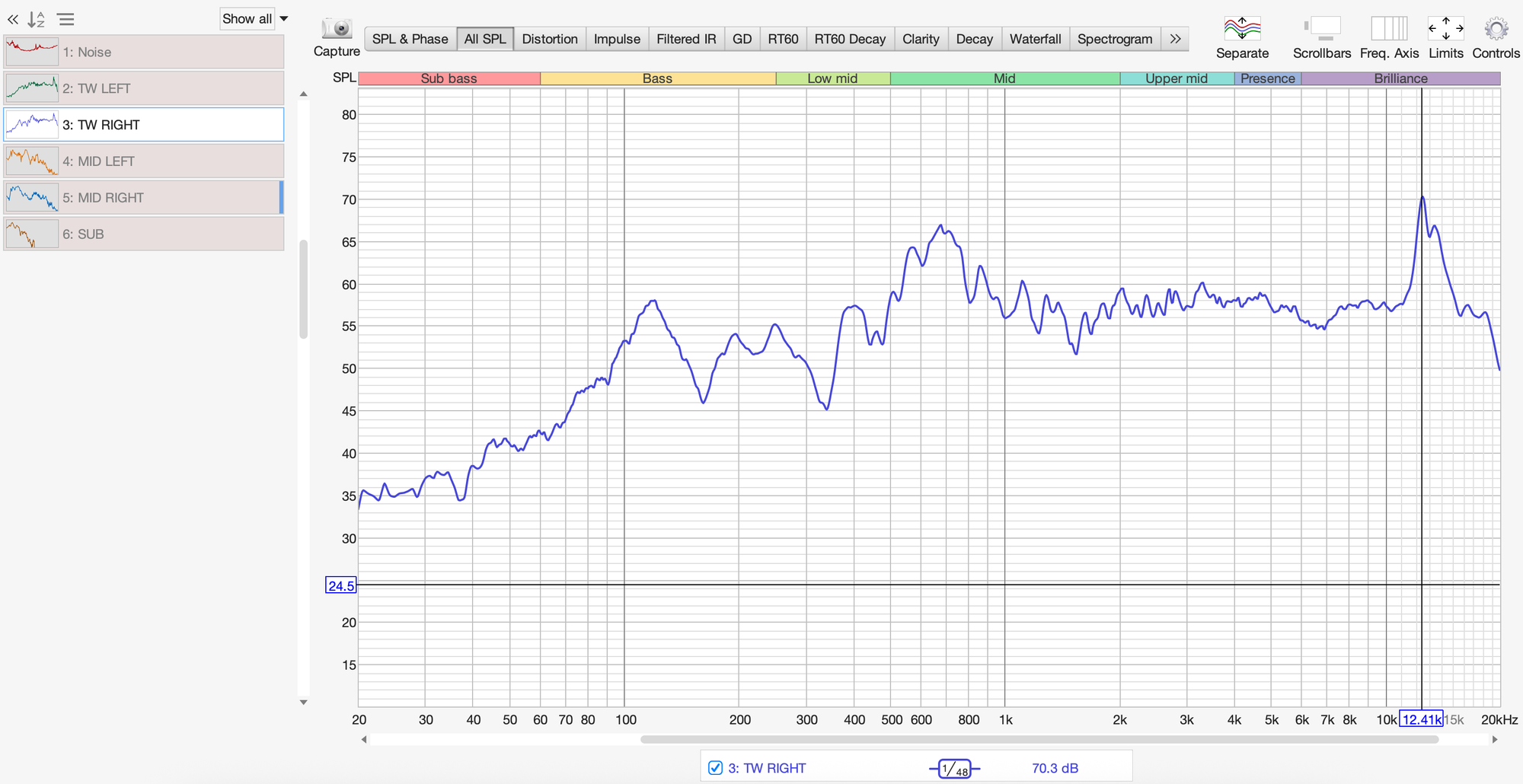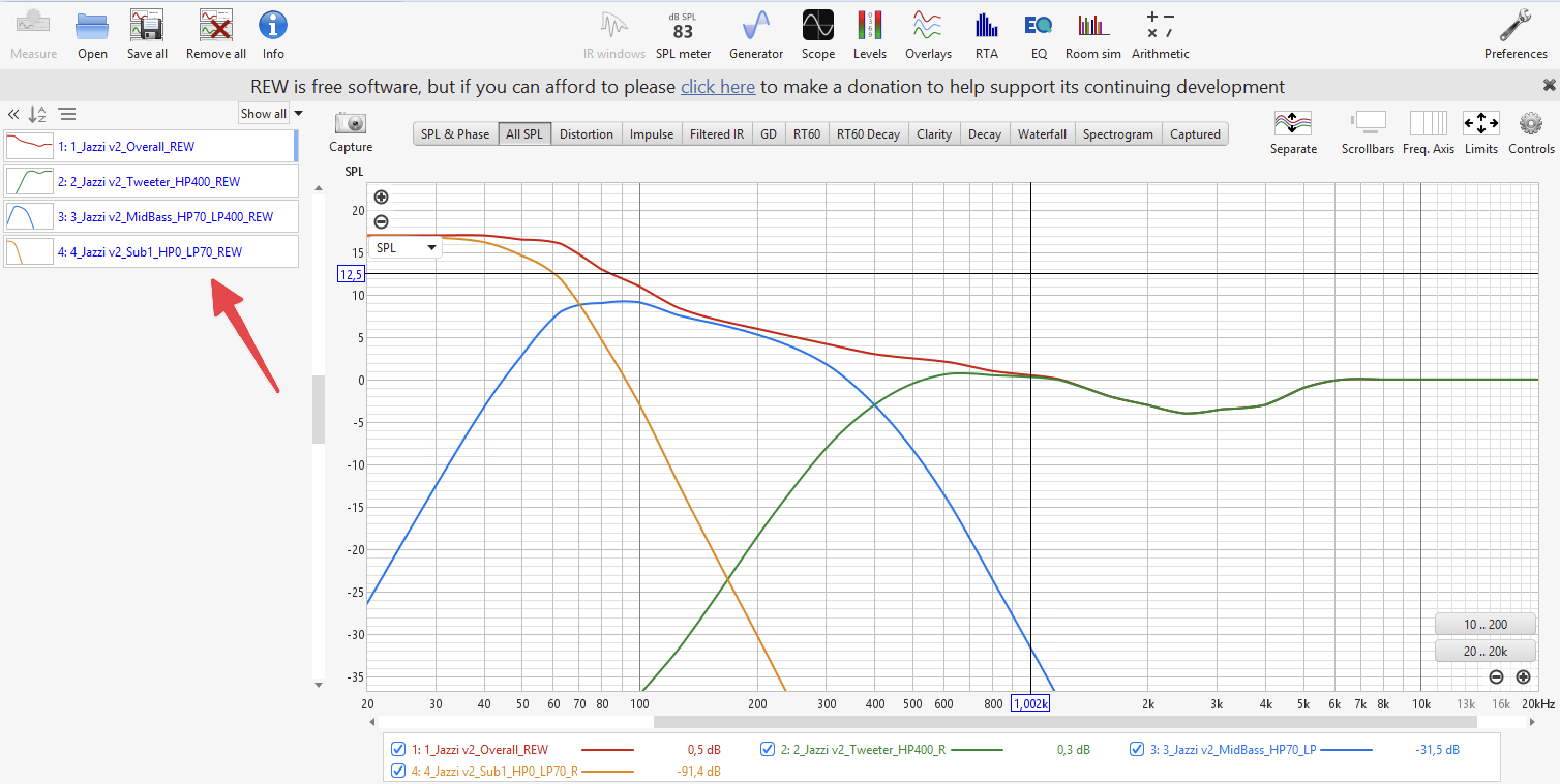 И с активными графиками всё также можно временно включать и выключать представление на вкладке "All SPL" галочками снизу. Это новшество упрощает работу, особенно когда у вас под 30-50 измерений (с разными кроссоверами, фильтрам, для сравнения). Иногда нам надо видеть только два или три графика, постоянно включать/выключать для анализа, а в 30 галочках можно легко запутаться. А так мы выделяем только определенный набор активных графиков в панели слева, и потом уже можно включать/выключать их галочками снизу.