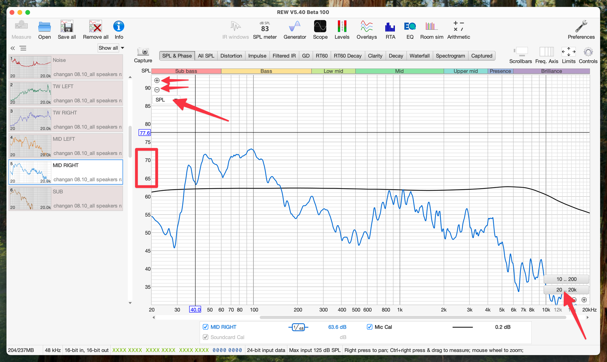 Также проверим, что у нас вертикальной шкалой выбрано "SPL", на горизонтальной шкале диапазон 20Гц - 20 кГц, а сама шкала SPL имеет шаг в 5 dB: