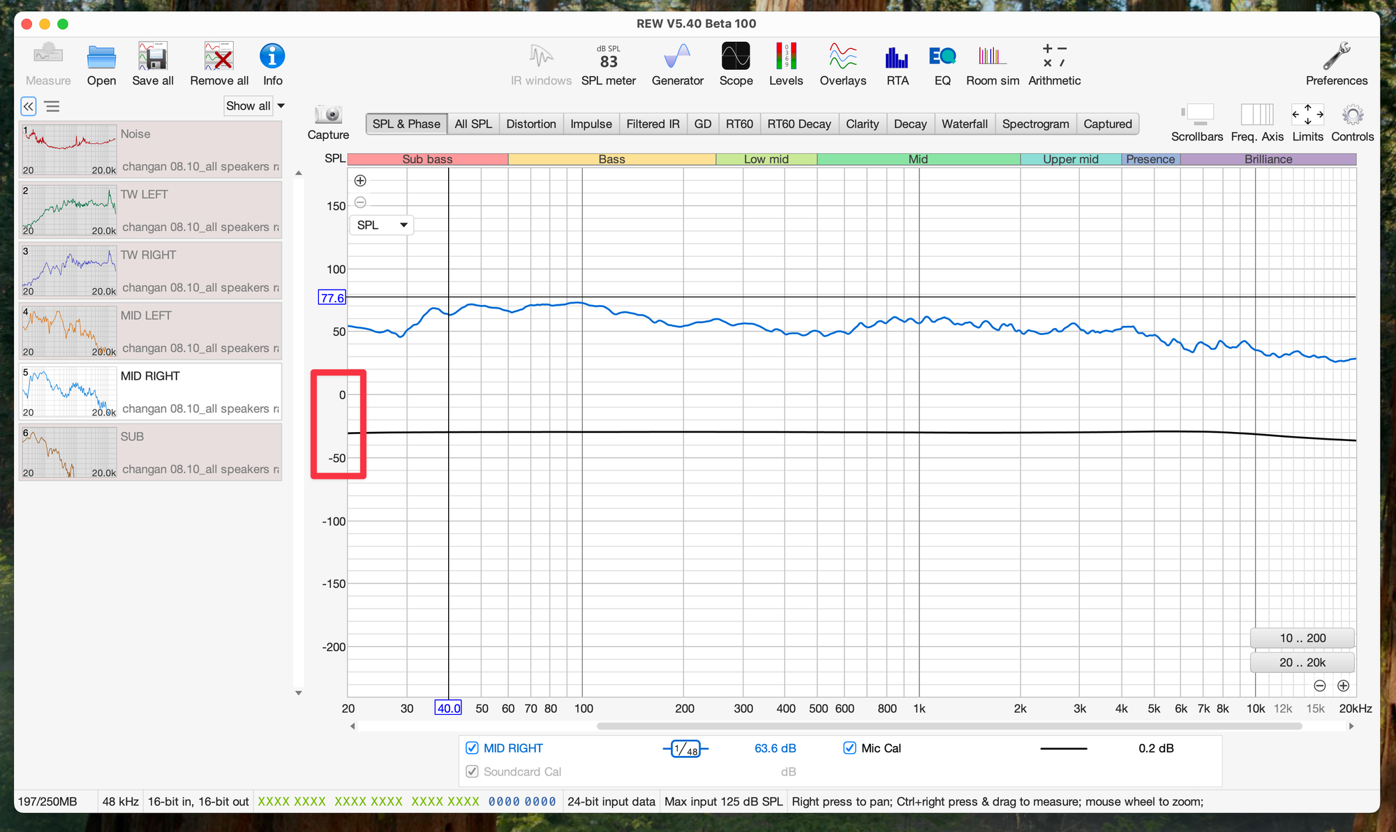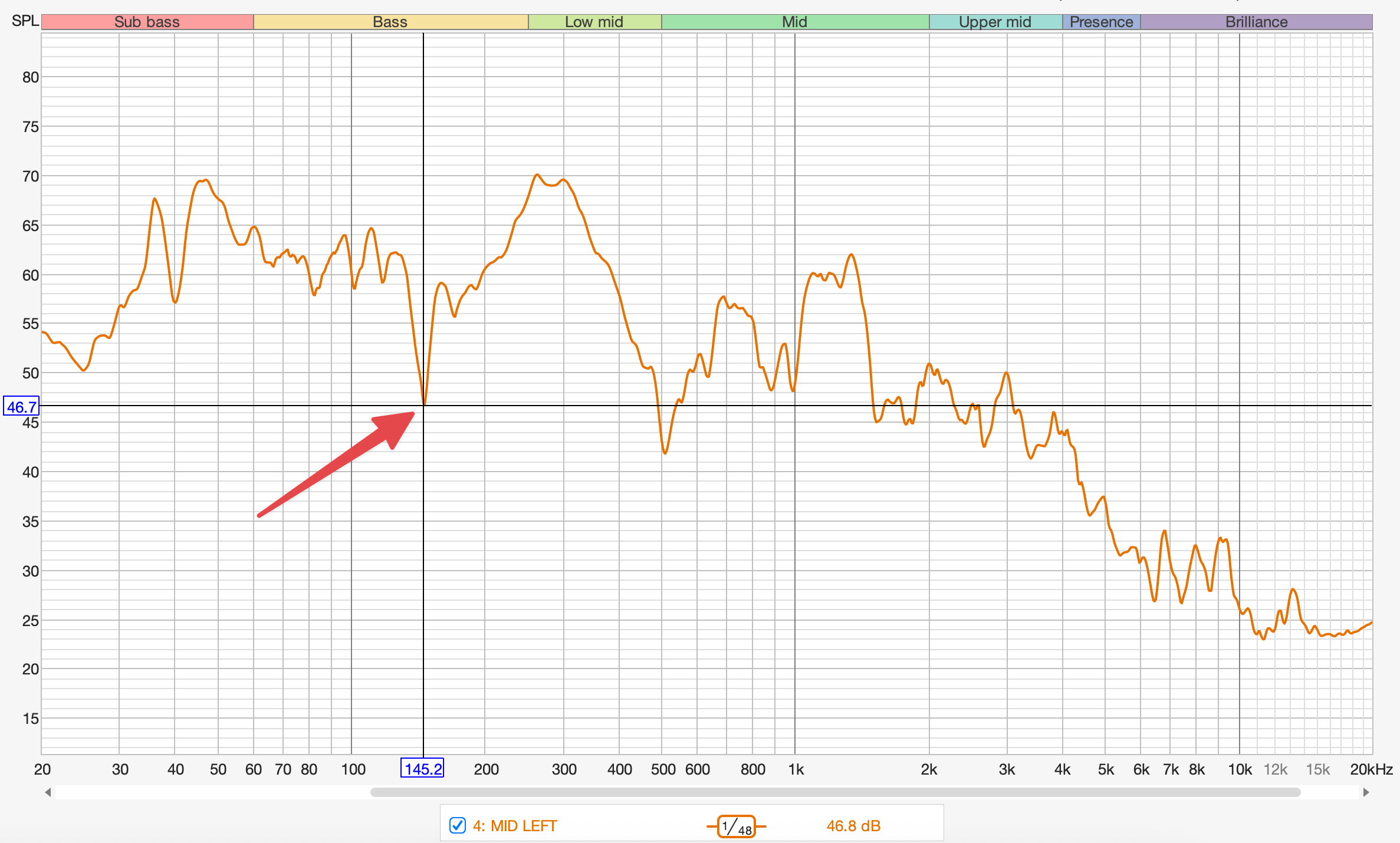 У левого мида есть достаточно узкий провал в районе 145 Гц, но это является классическим провалом левого мида в двери в штатном расположении, ввиду действия деструктивной интреференции (cancelation) на этой частоте, помогают отражения от центрольной консоли (у меня в автомобиле "парящий мост"), либо от правой дверной панели. В любом случае такой провал наблюдается в основном в диапазоне от 130-190 Гц и в большинстве автомобилей. Такой провал исправить почти невозможно, но что-то попробуем для его нивилирования на этапе эквализации.