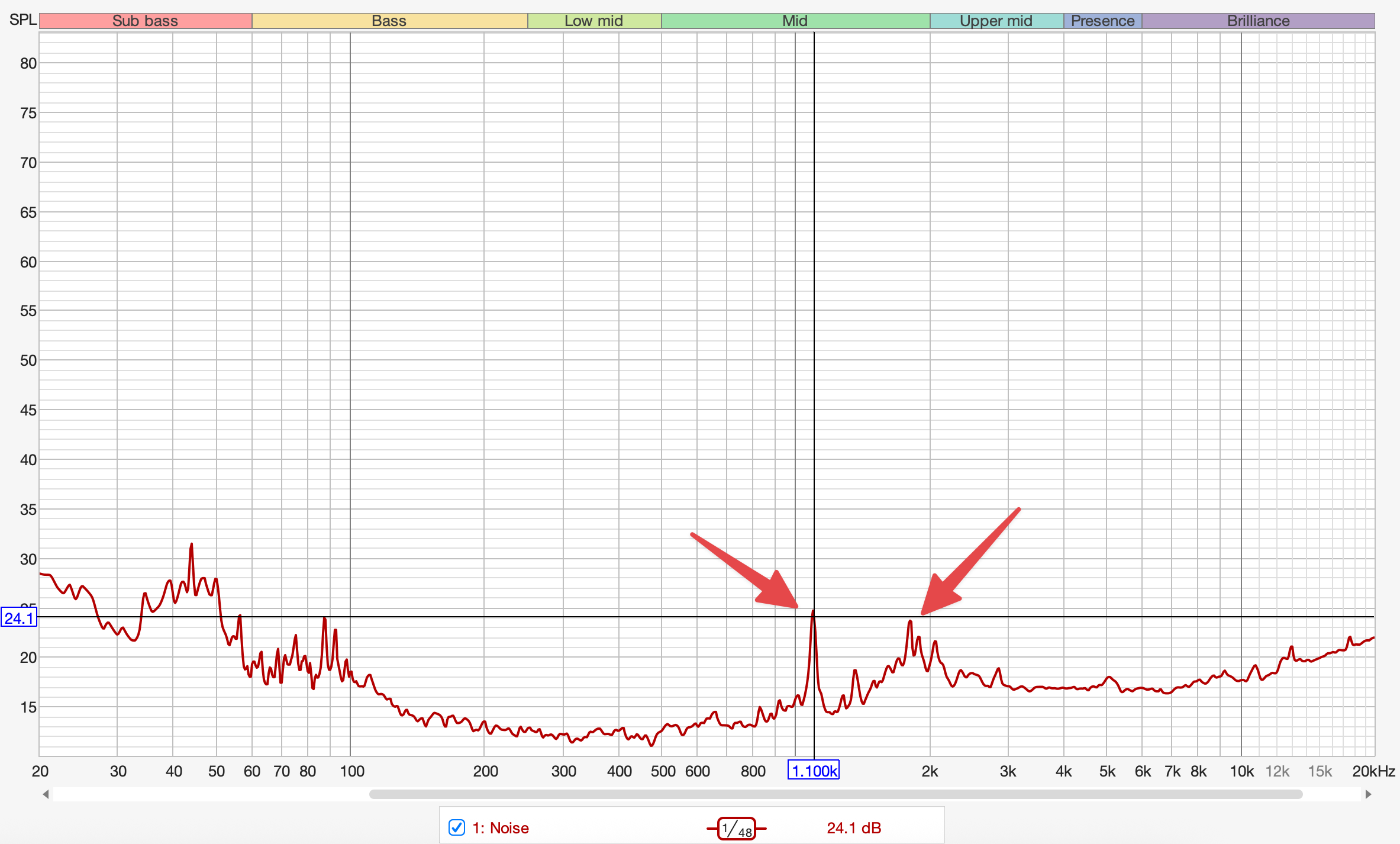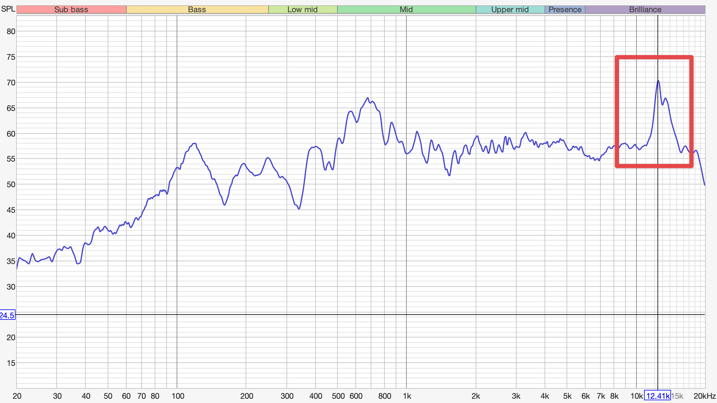 Изначально я решил, что это особенность расположения ширика у стекол, конструкции подиума с полусферой, но потом выполнял замеры данного ширика просто висячим в воздухе, и всё тоже самое. Я искал информацию по данной теме, и по факту это оказалась известная особенность динамиков с алюминиевым дифузором и алюминиевым защитным колпачком (плюс там присутствует алюминиевая "юбка" вокруг колпачка), взаимная работа которых на стыке конструкций приводит к значительному усилению и всплеску на данном диапазоне частот. Убирается всё это эквалайзером в DSP