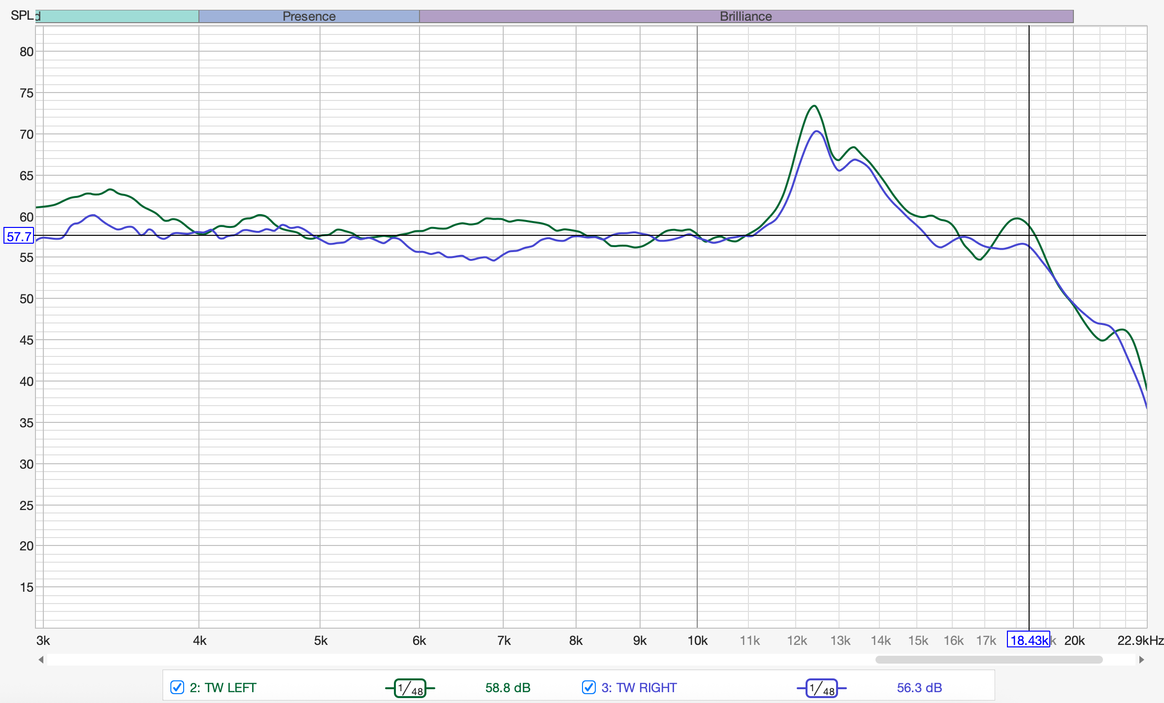 Если посмотрим на самый верхний ВЧ диапазон, то спад по обоим ширикам начинается после 18-18,5 кГц, что в принципе неплохой результат. Лично я уже с трудом слышу что-то внятное после 17 кГц, поэтому меня это более чем устраивает:
