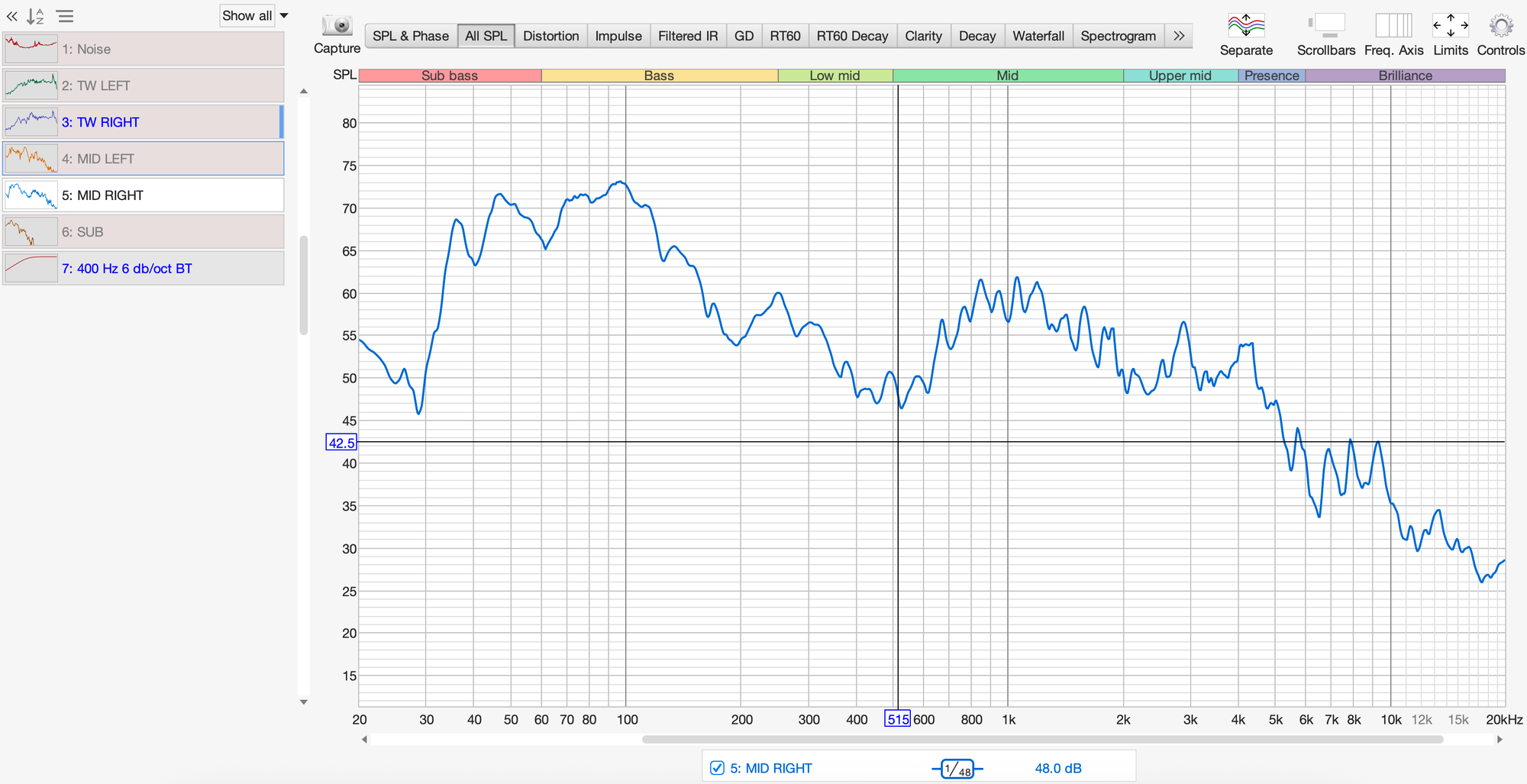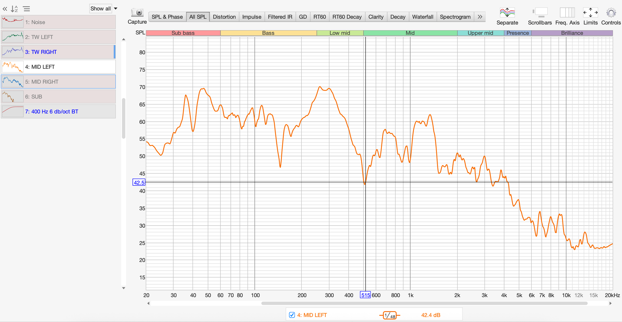 Ввиду того, что у нас имеется ширик, который мы можем состыковать с мидом начиная с 400 Гц, а у нас на правом миде наблюдается провал на 515 Гц, то мы попробуем задать точку кроссовера пониже, как раз на 400 Гц, до точки провала, а данный провал немного подкорректируем уже на графике спада после применения кроссовера.