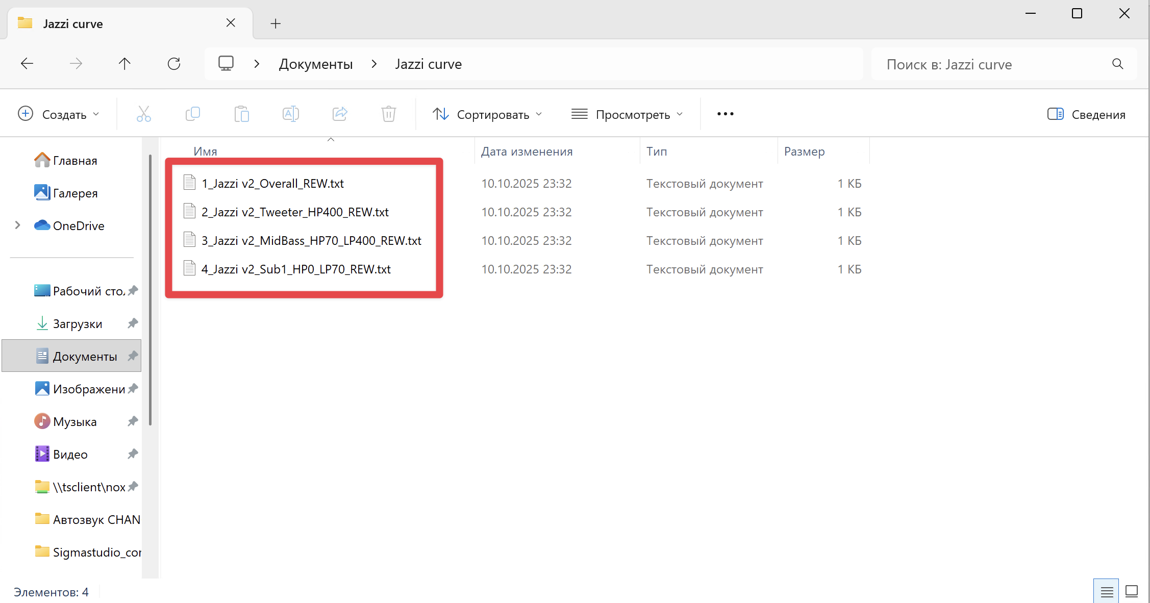 В выбранной папке увидим комплект файлов с кривым, один файл общей целевой кривой, и отдельно кривые для каждой полосы (саб, мидбас, твитре):