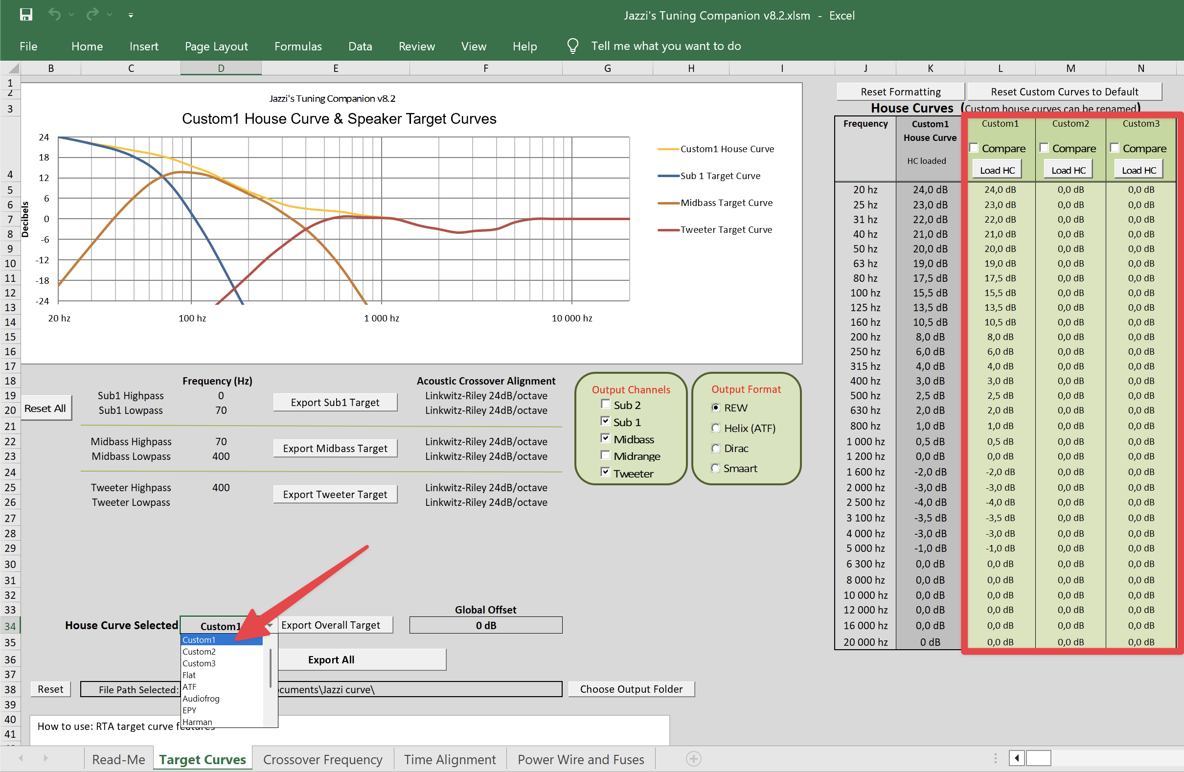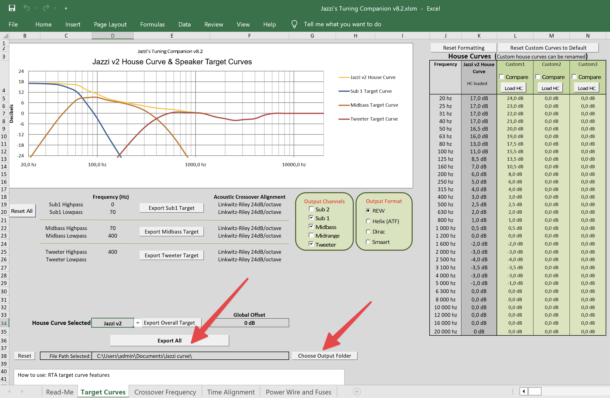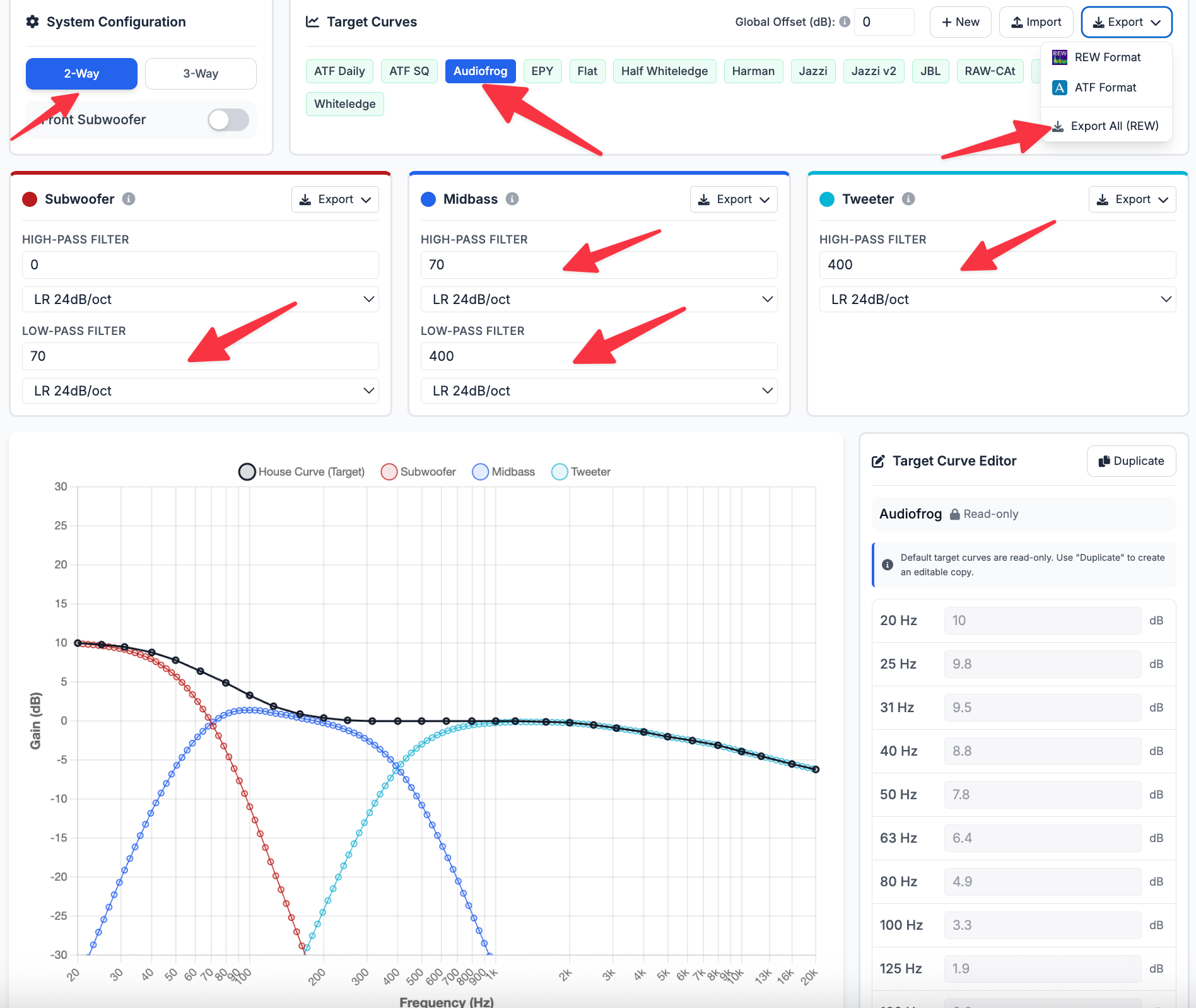 Здесь мы также можем выбирать общие целевые кривые, вносить значения выбранных кроссоверов, и в конце скачать комплект все полученных целевых кривых (Export All (REW)):