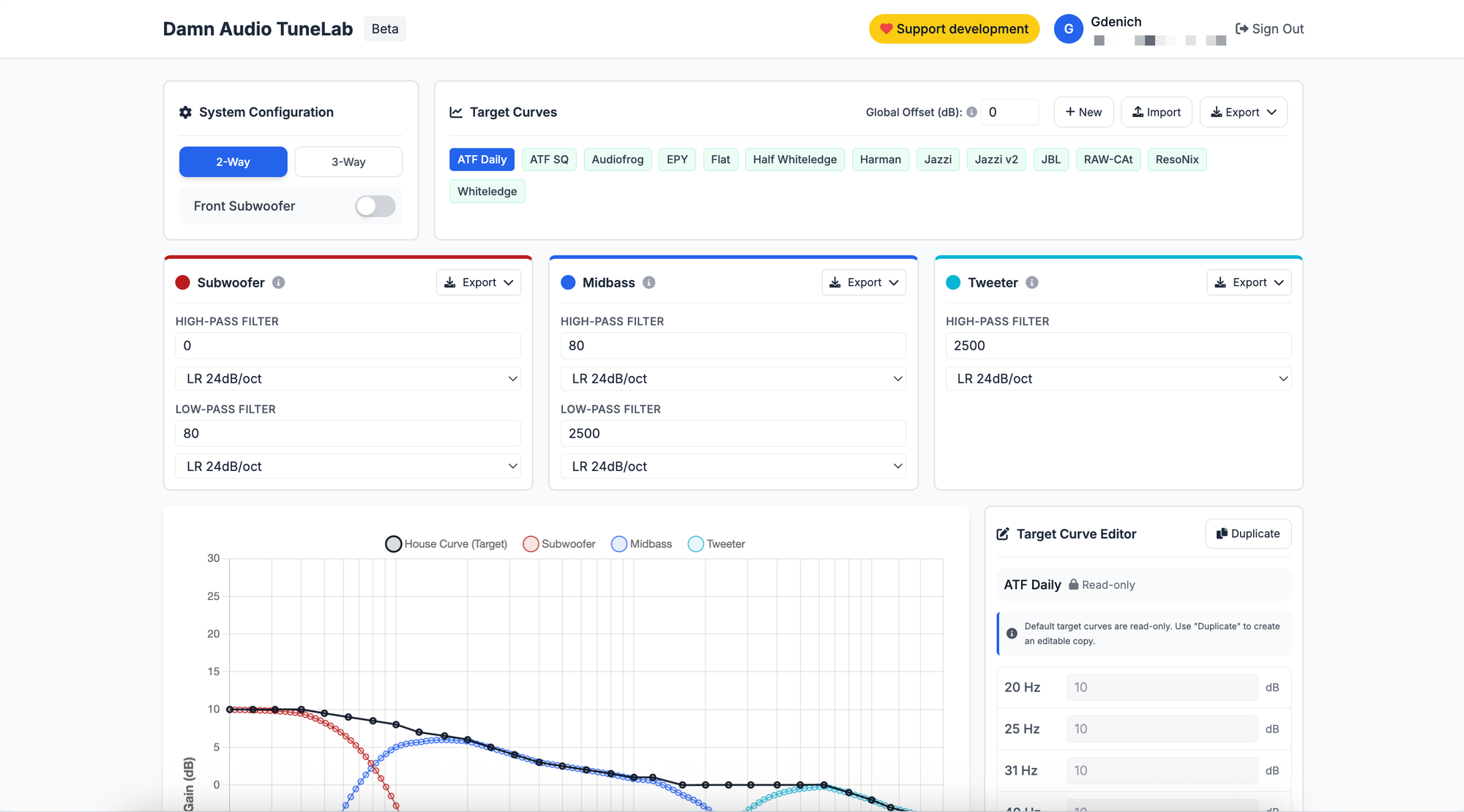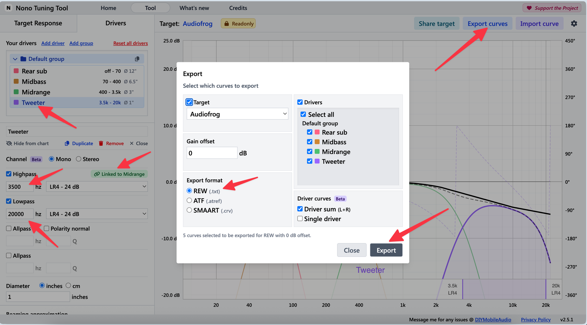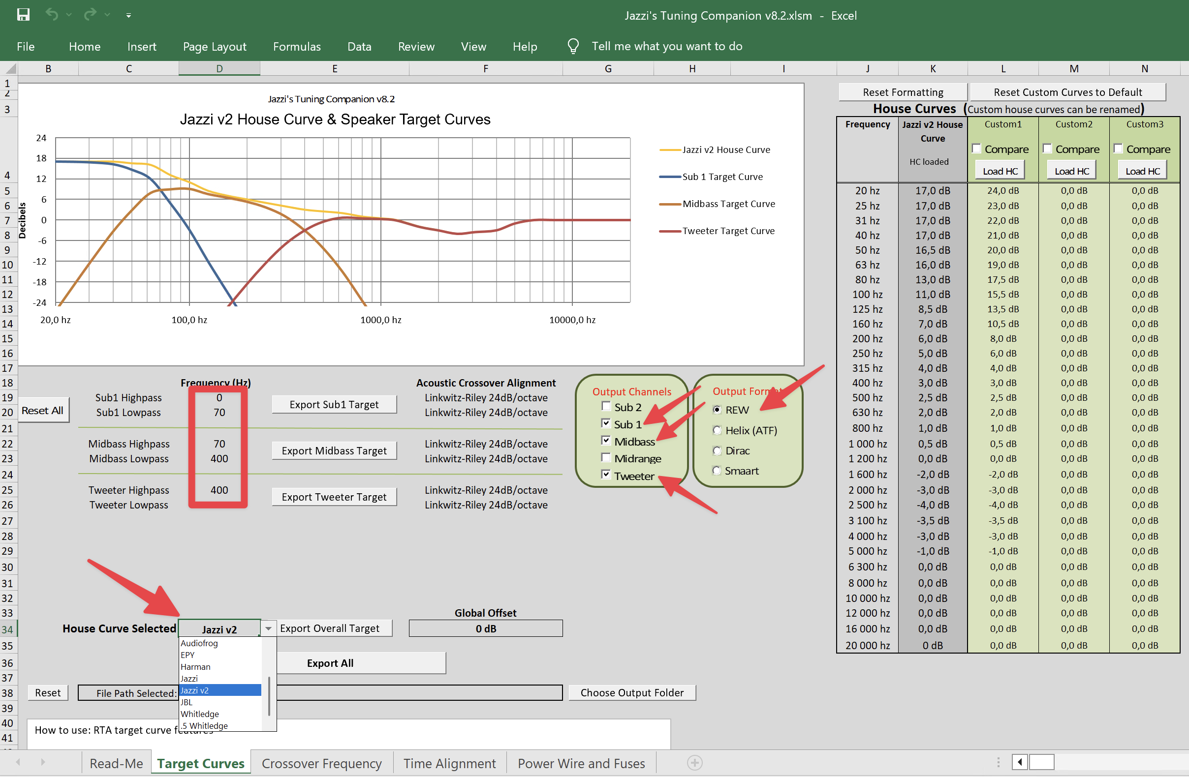 Здесь мы также можем выбирать общие целевые кривые, вносить значения выбранных кроссоверов, и в конце скачать комплект все полученных целевых кривых (Export All (REW)):