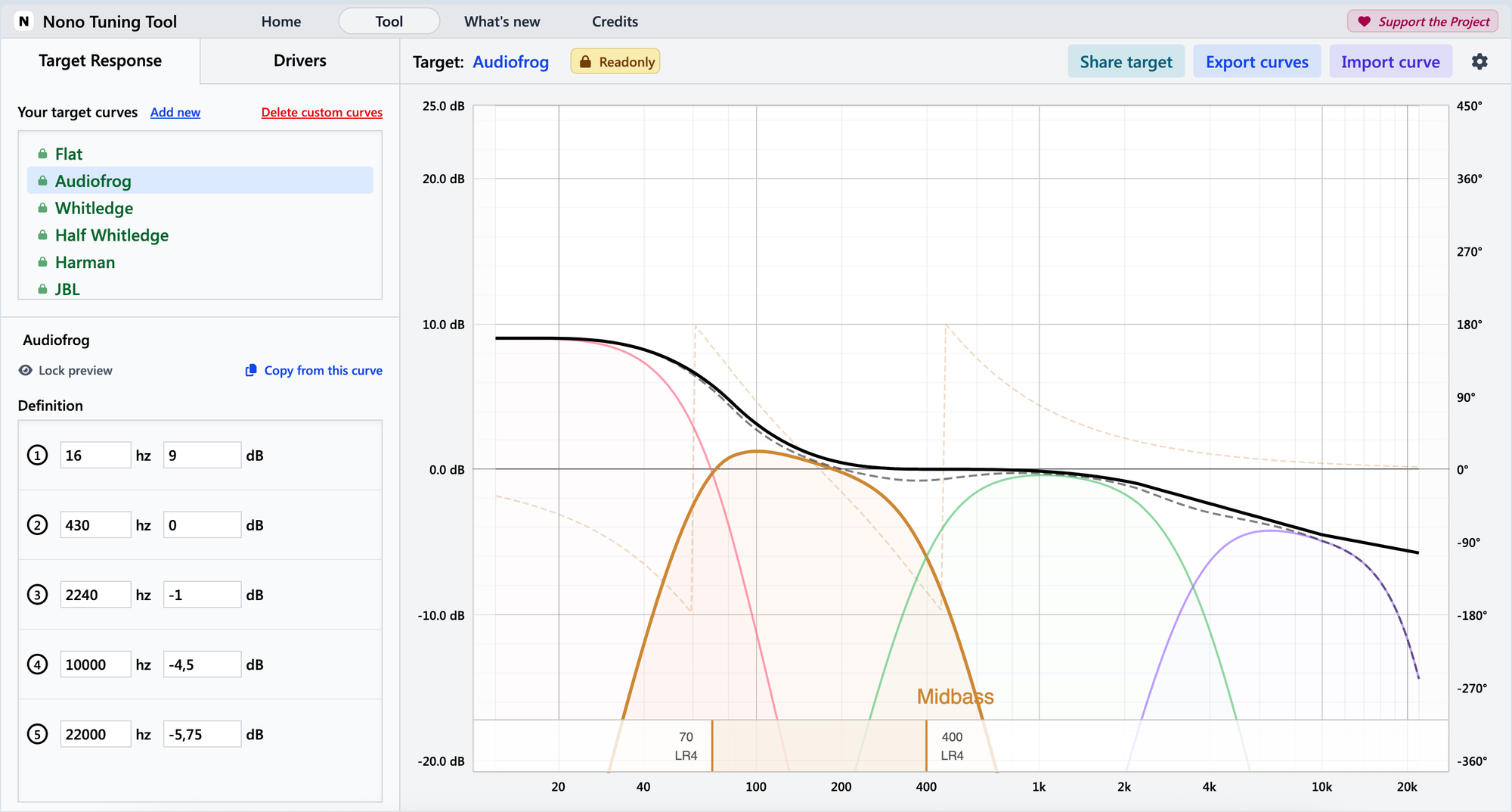 Проект одного из участников diymobileaudio.com, тема на форму по ссылке: Nono Tuning Tool: Target Curve Generator for REW, PC-Tool and SMAART