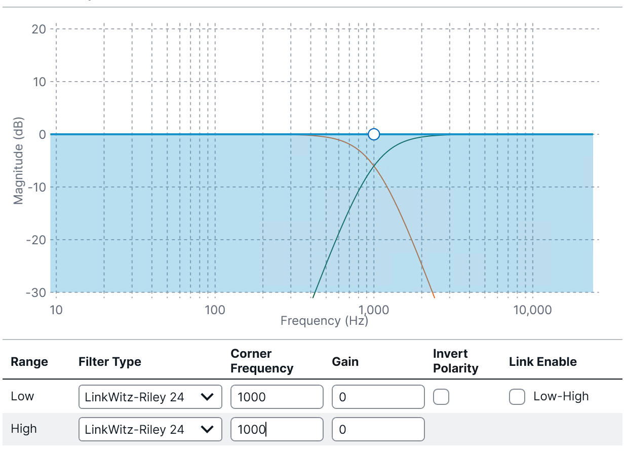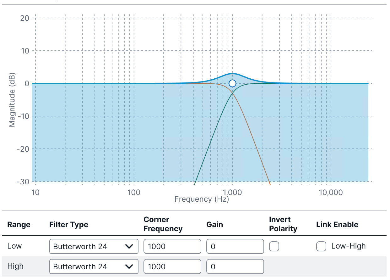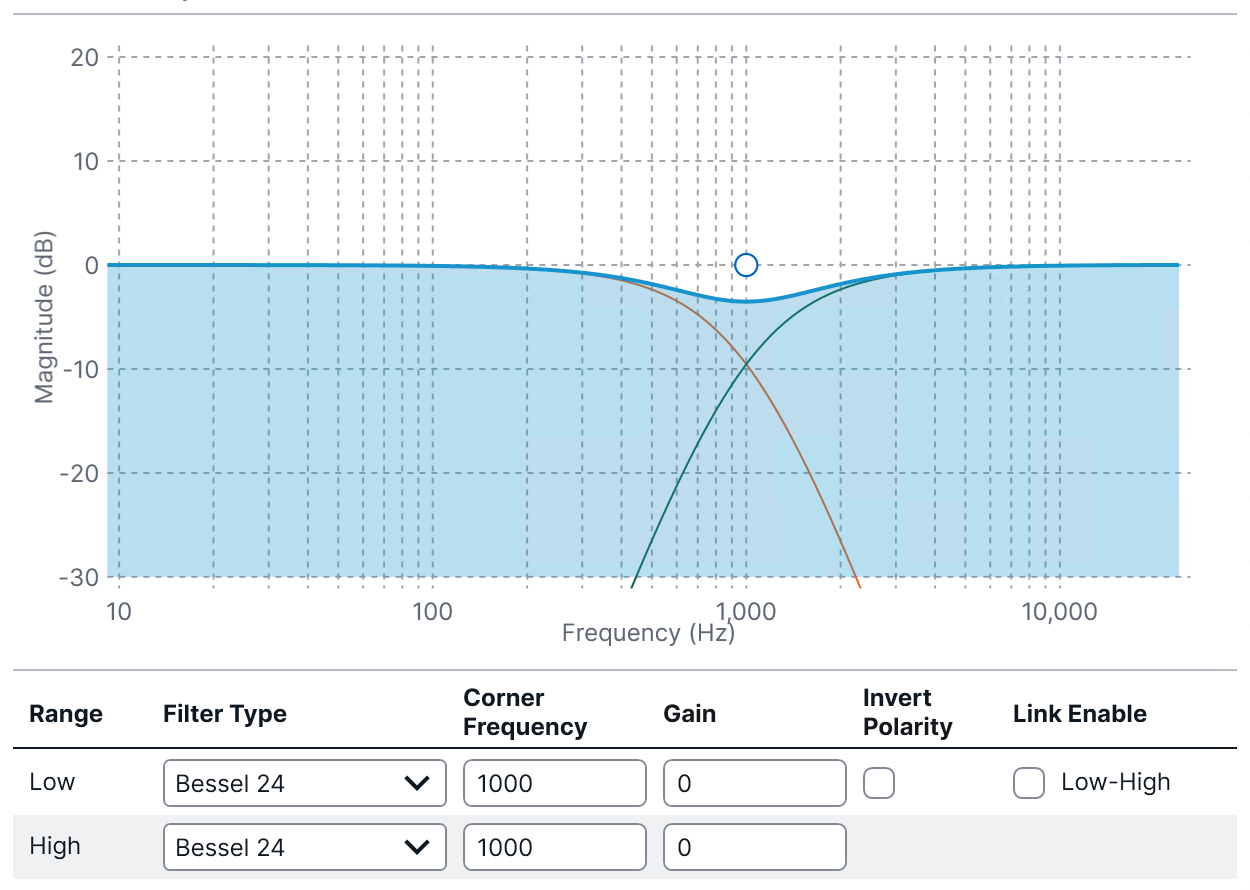 - плавный переход от одной полосы к другой, с максимальной линейностью АЧХ (0 дБ) и фазы (360° = 0°) в точке стыковки;