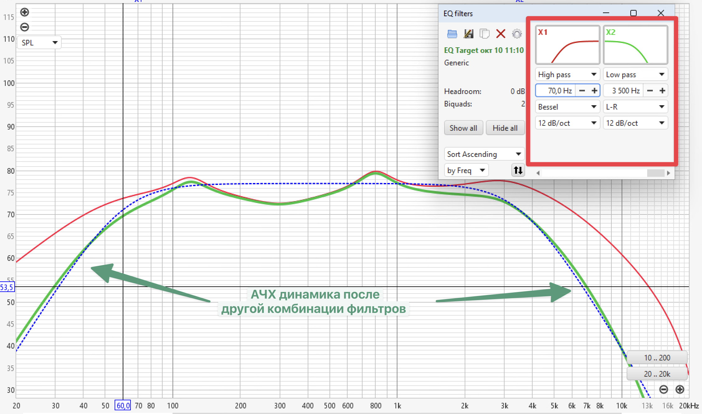 В этом примере я применил HPS фильтр 70 Hz Bessel 12 db/oct и LPF фильтр 3500 Hz LR 12 db/oct, чтобы получить требуемый акустический отклик со спадами 24 db/oct LR: