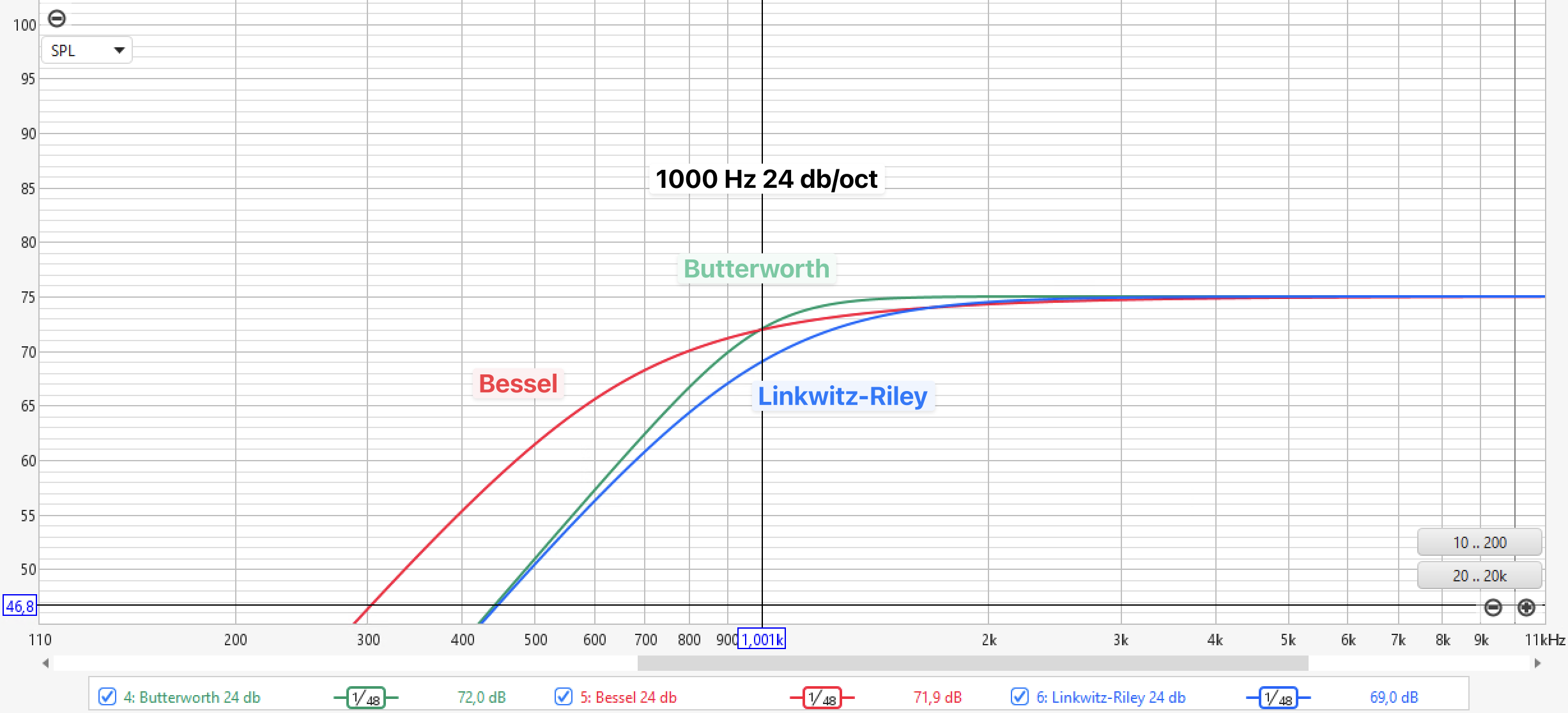 А вот на изображении можно увидеть, как вообще отличаются фильтры Butterworth, Bessel, Linkwitz-Riley например на частоте 1 кГц с крутизной спада 24 дб/окт: