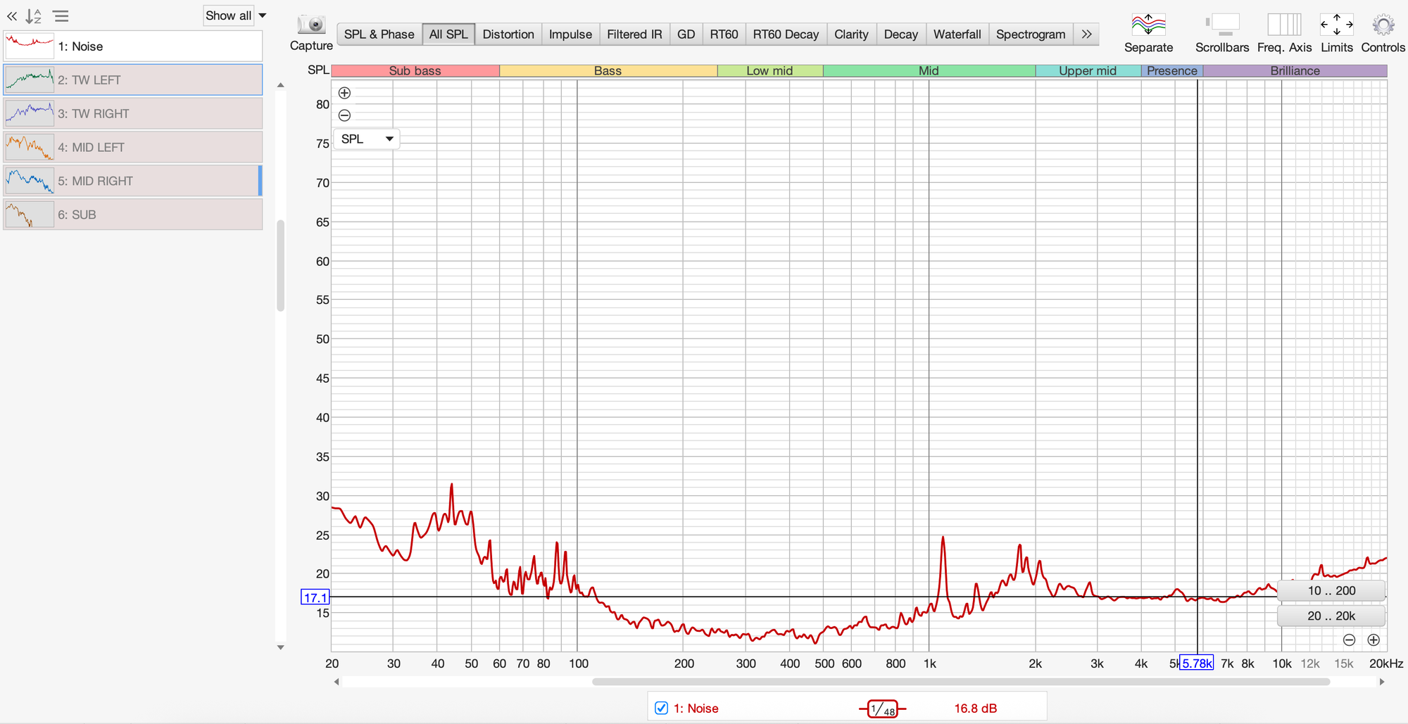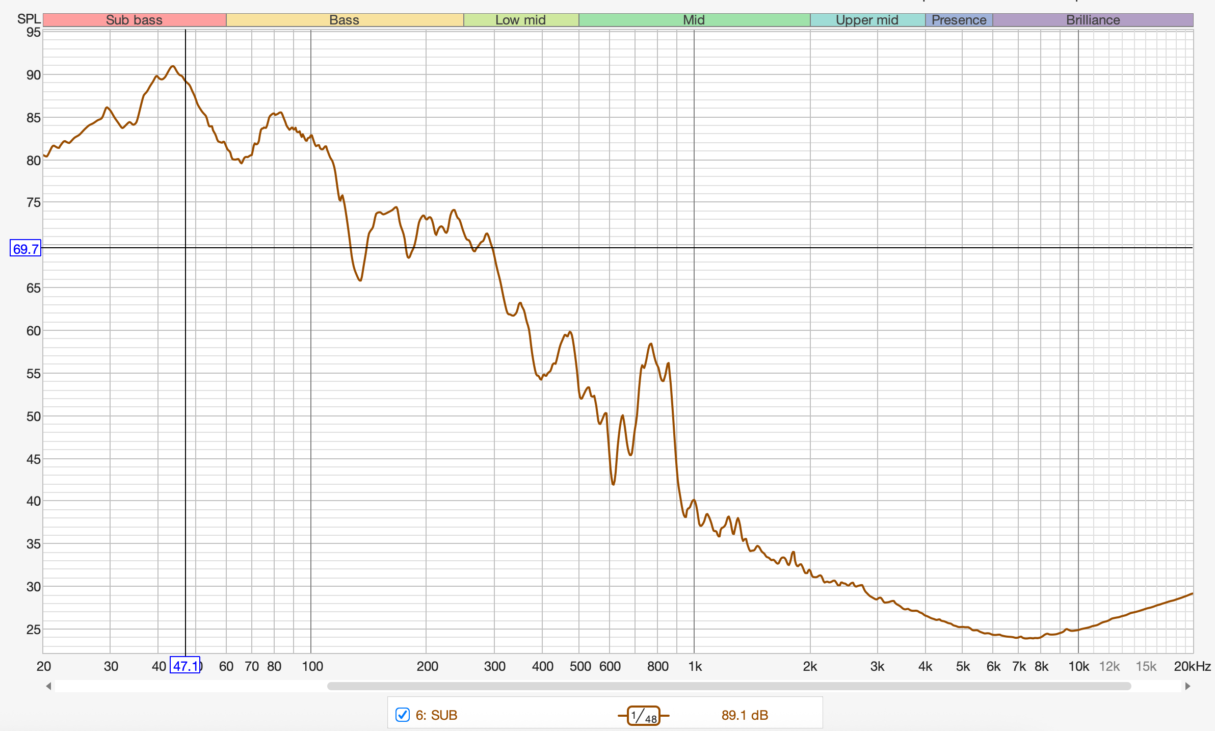 Уровень саба конечно значительно выше уровня остальных динамиков, в среднем +16-18 дБ, что в принципе будет очень кстати для целевой кривой, которую я хочу реализовать в этот раз в системе:
