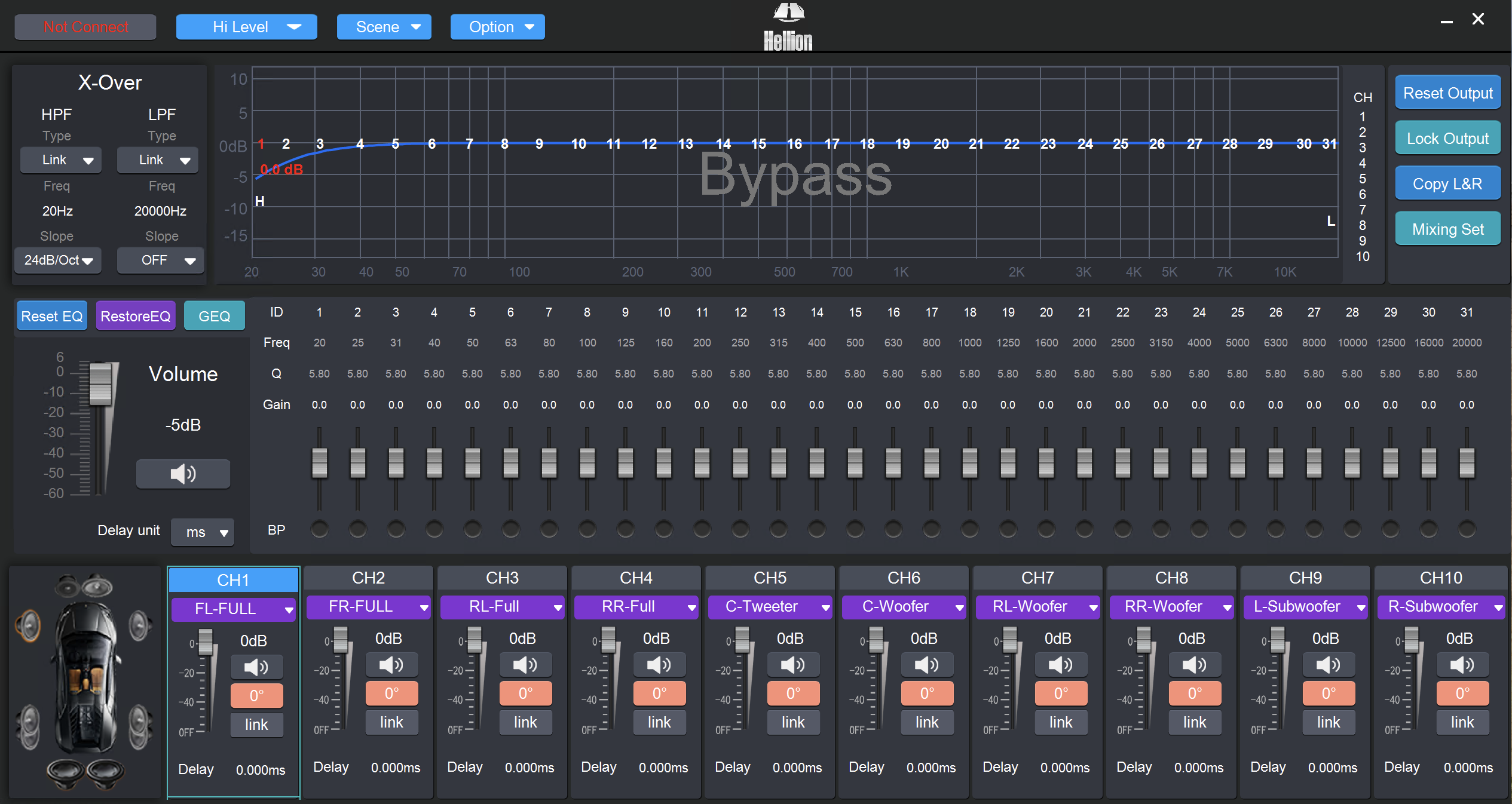 Интерфейс программного обеспечения настройки процессоров/процессорных усилителей Hellion Audio схож для всех моделей (DHL-6 / DHL-10 / HAM 4.6pinDSP / HAM 6.80DSP / HAM 8.10DSP / HAM 8.100DSP), различаются только параметрами фильтров (добротность) и количеством каналов.
