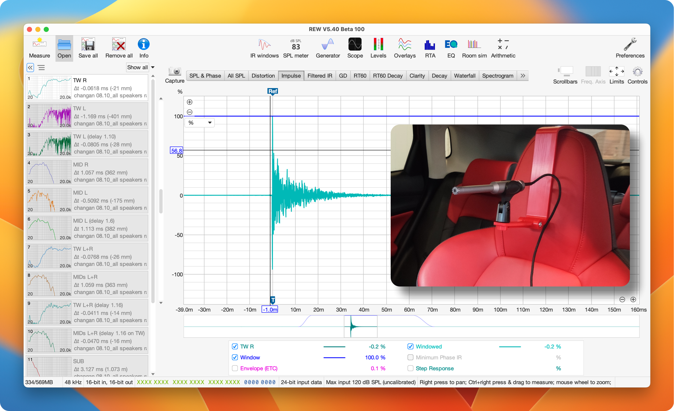 - с помощью снятия импульсной характеристики каждого динамика микрофоном и выравнивание по времени импульса и фазе сигнала в точке кроссовера с помощью инструментов REW (как с помощью аудио-интерфейса с Loopback, так и с помощью USB- микрофона и "Acoustic Timing Reference");