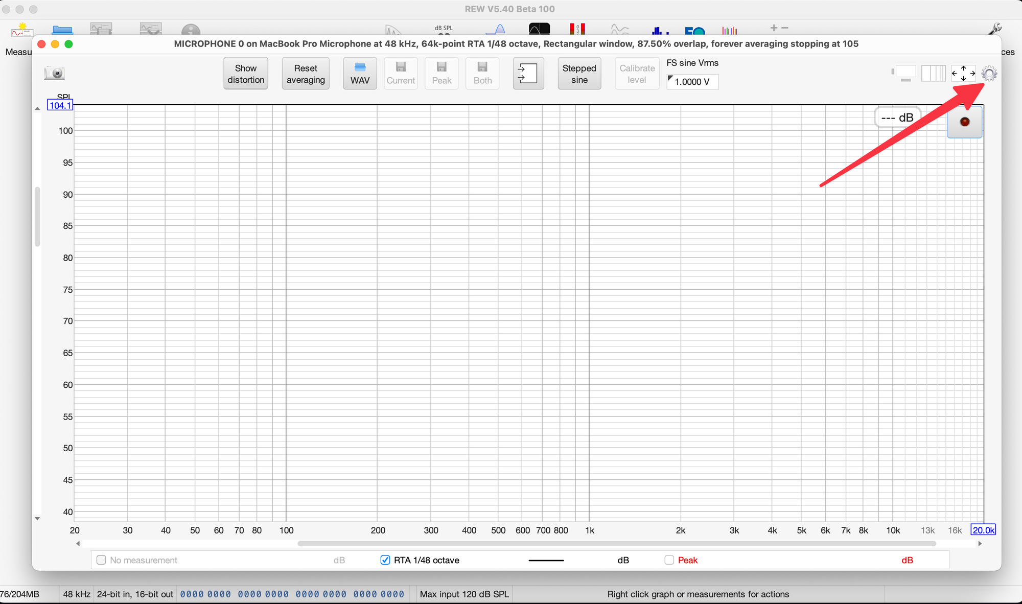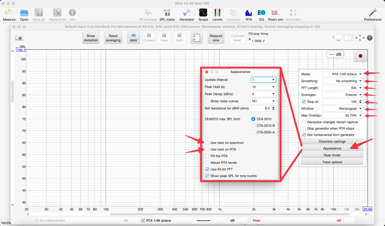 Перед началом измерений настроим окно RTA в REW следующим образом: