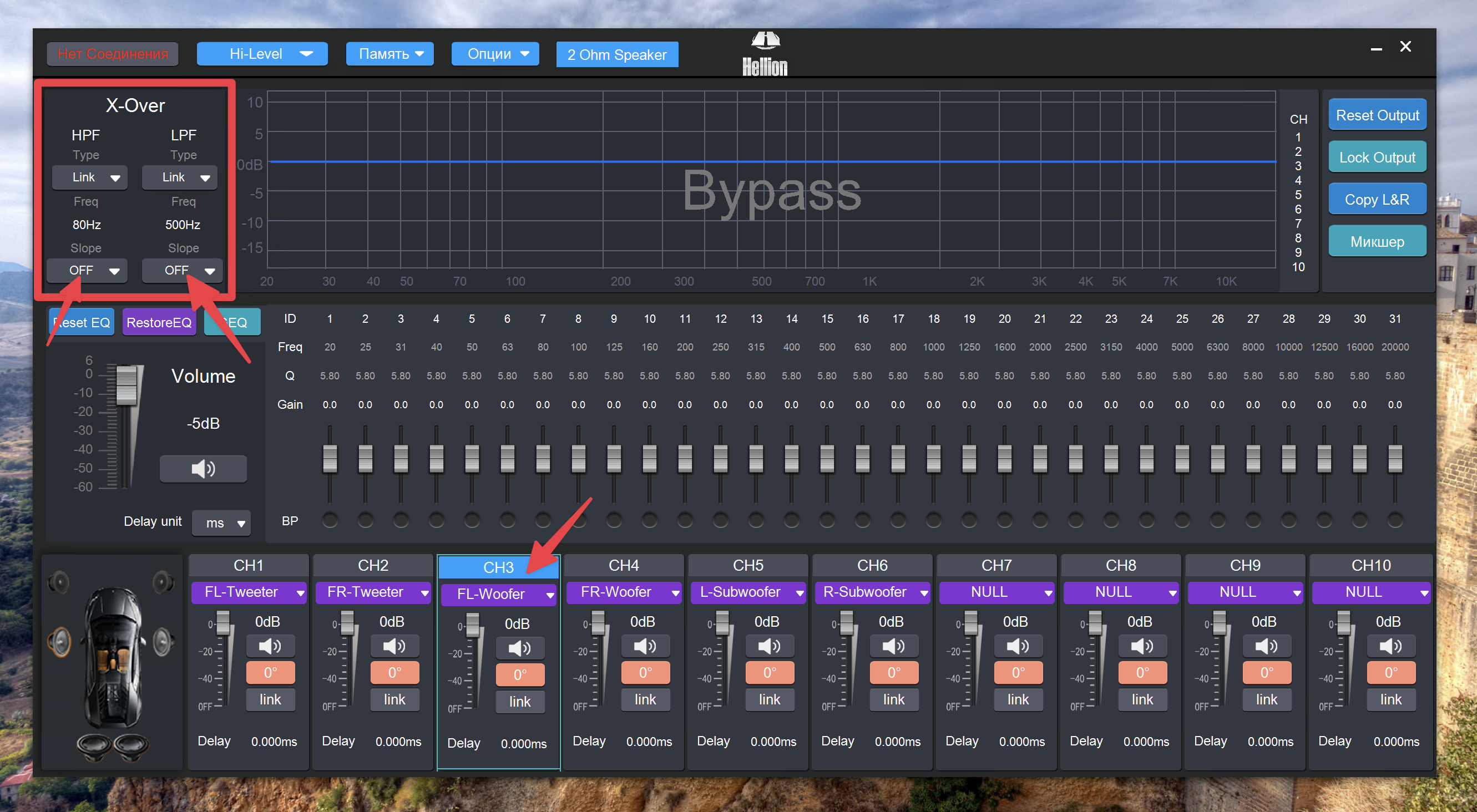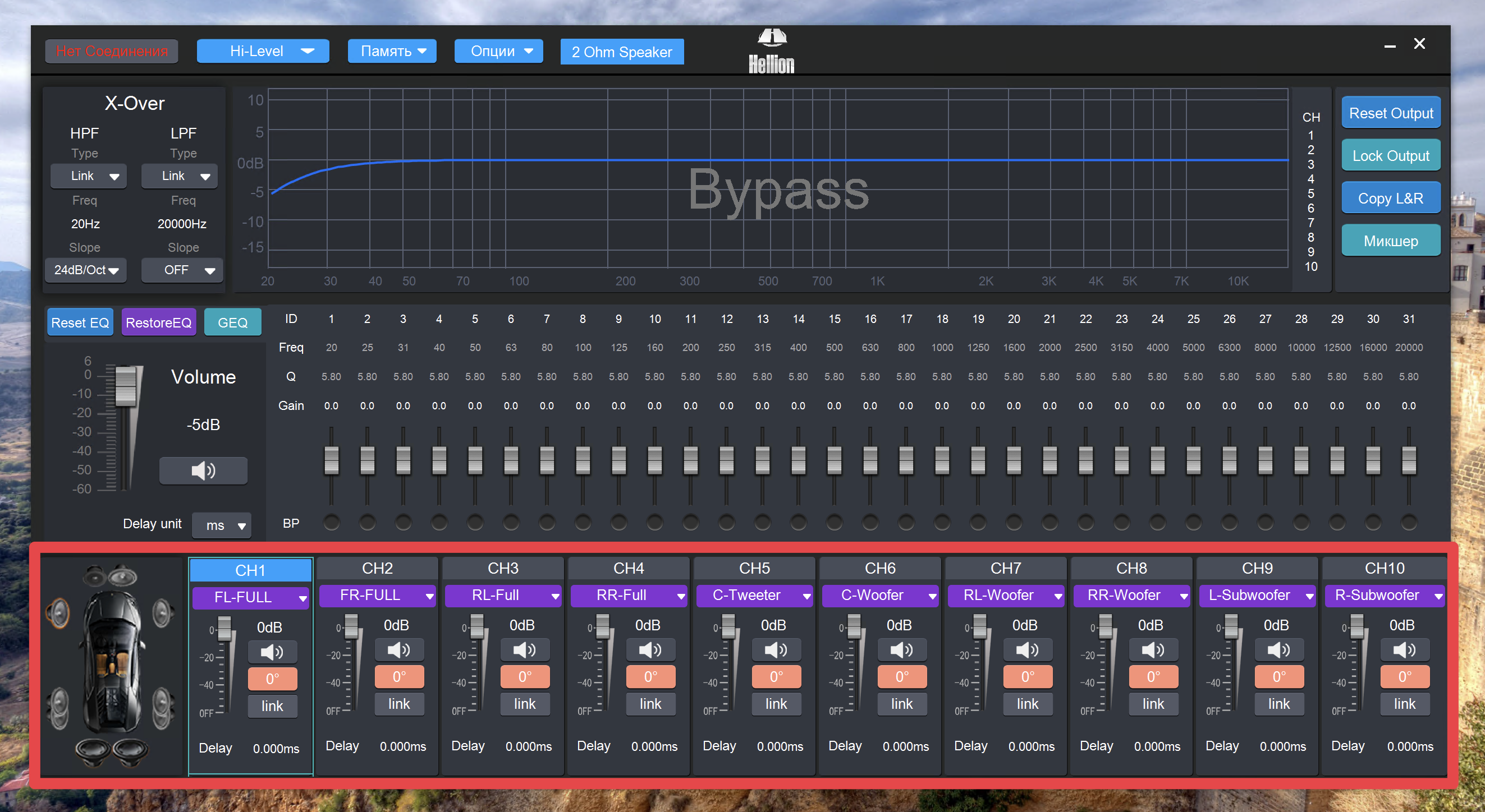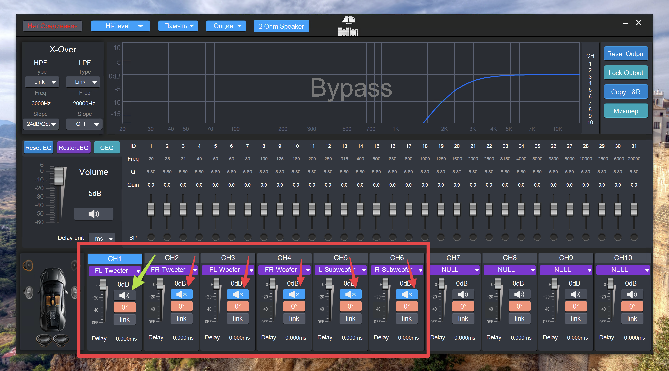 При переходе на каждый канал, мы видим, что ПО автоматически установило дефолтные значения кроссоверов для каждого конкретного канала, и нам они совсем не подходят, а некоторые и не нужны на данном этапе.