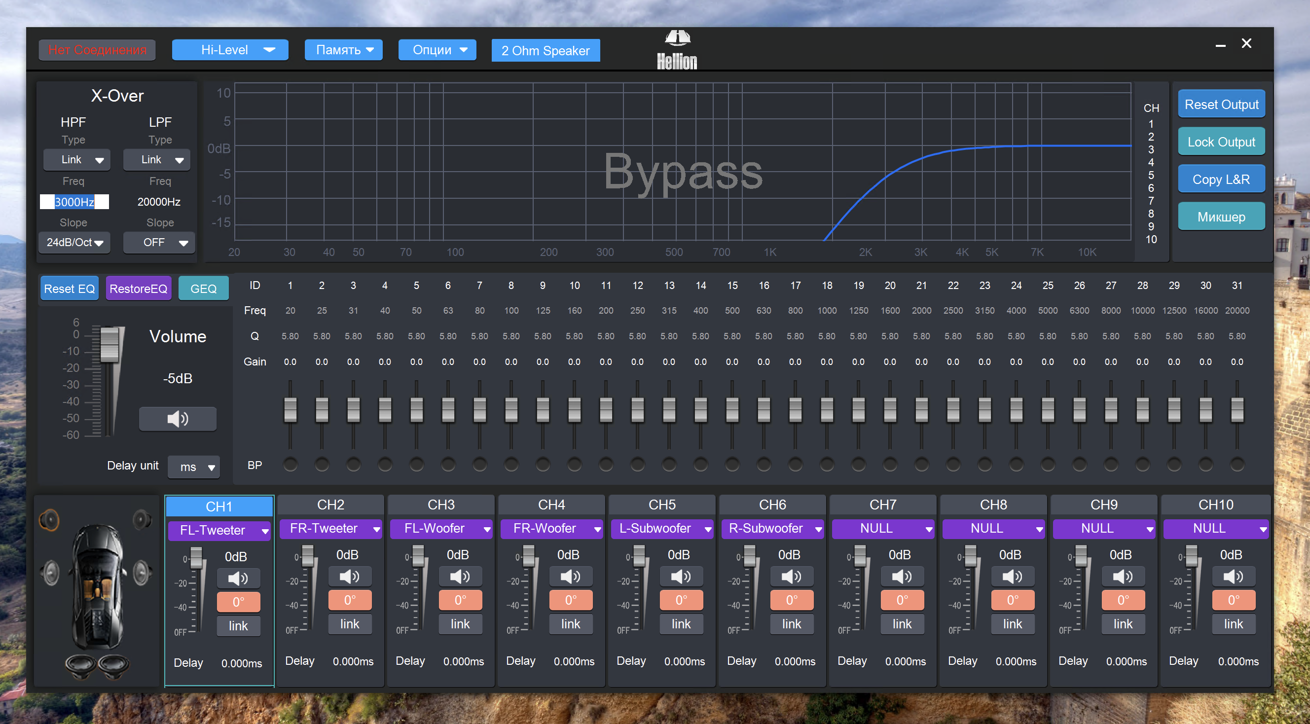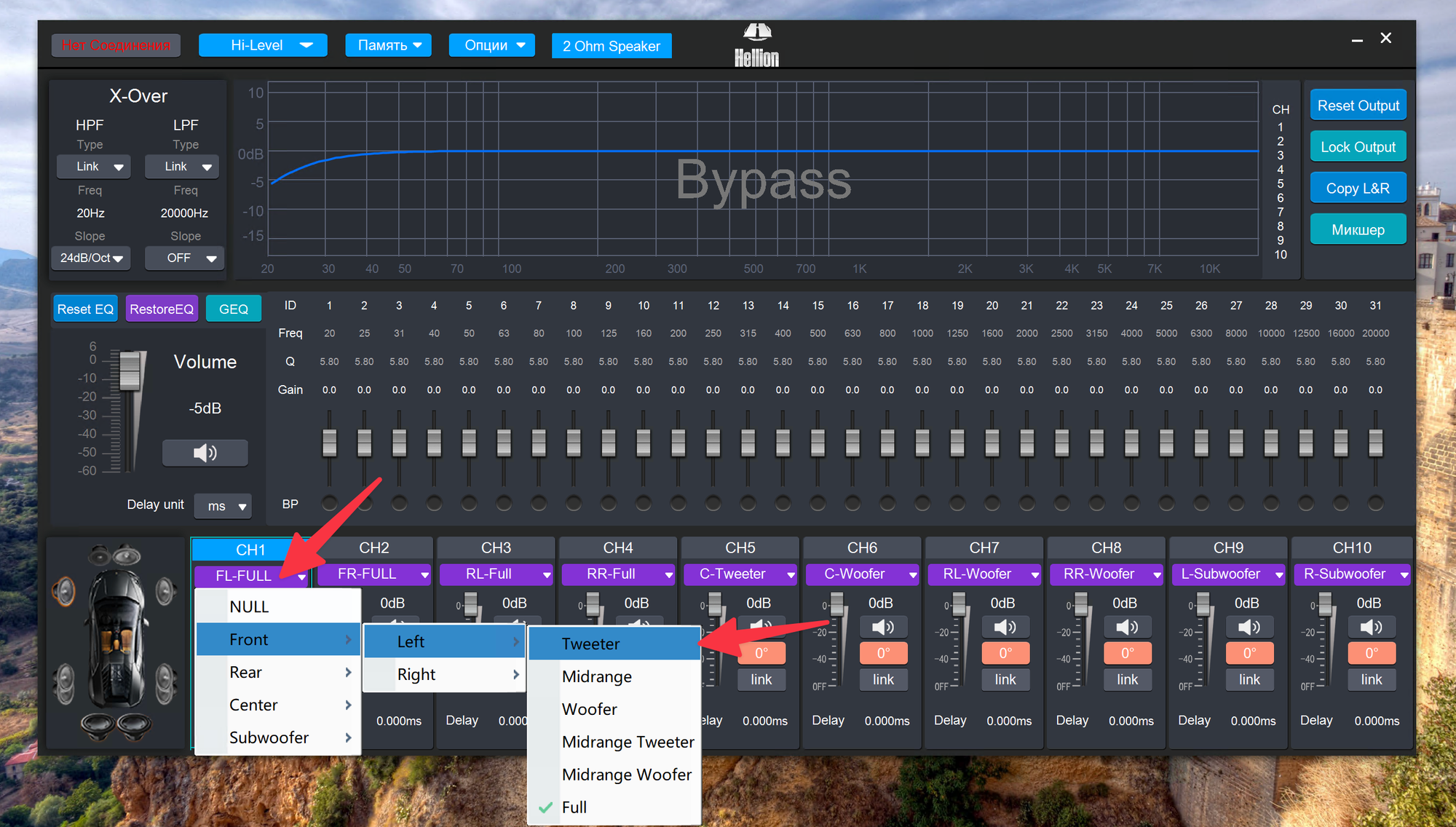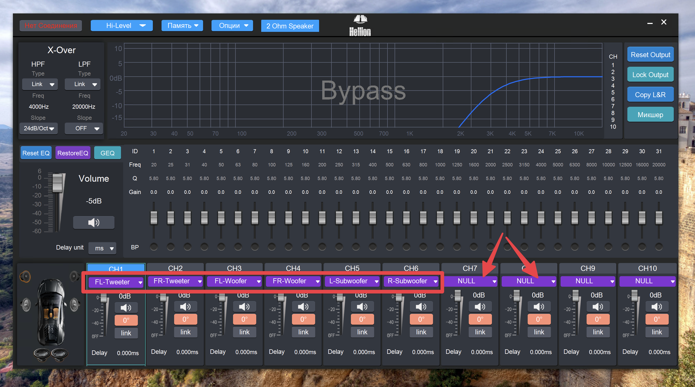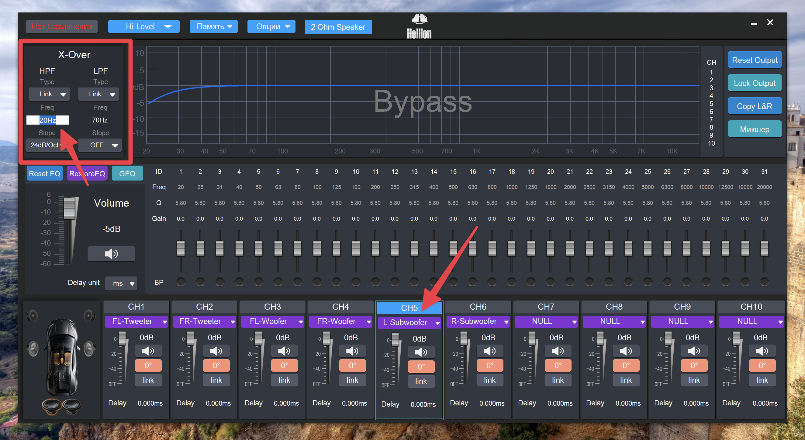 При переходе на каждый канал, мы видим, что ПО автоматически установило дефолтные значения кроссоверов для каждого конкретного канала, и нам они совсем не подходят, а некоторые и не нужны на данном этапе.