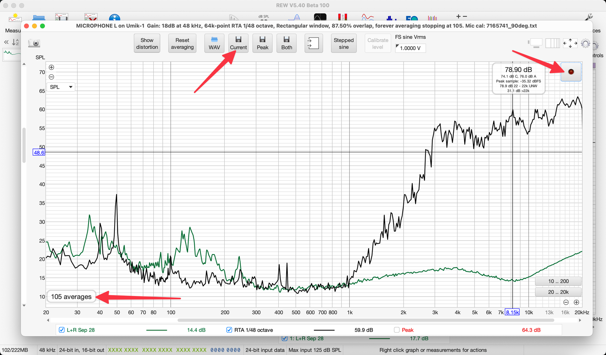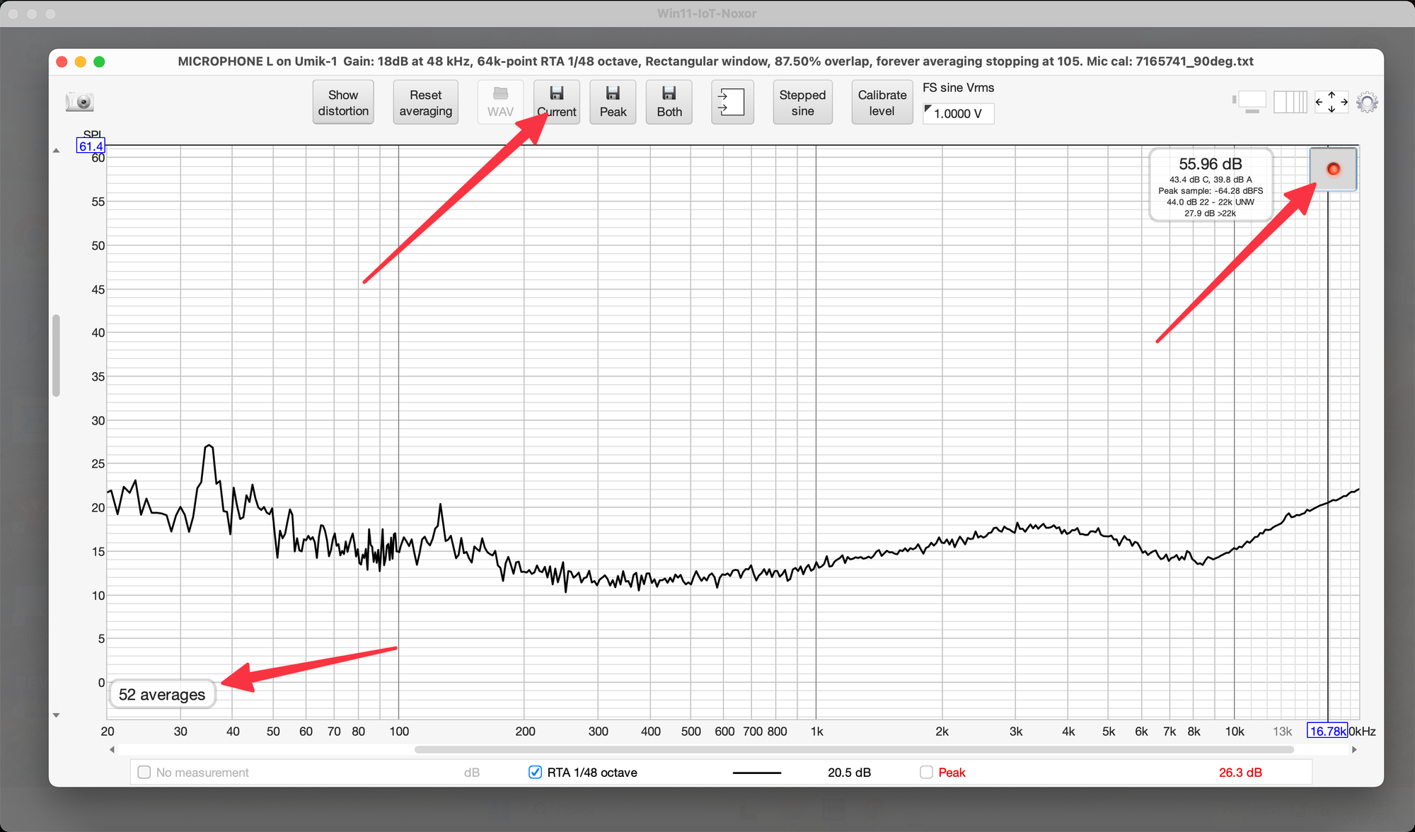 - по завершению отсчета усреднений (в моём случае 105) в окне RTA запись остановится сама, и нам потребуется сохранить полученный график опять кнопкой "Current":