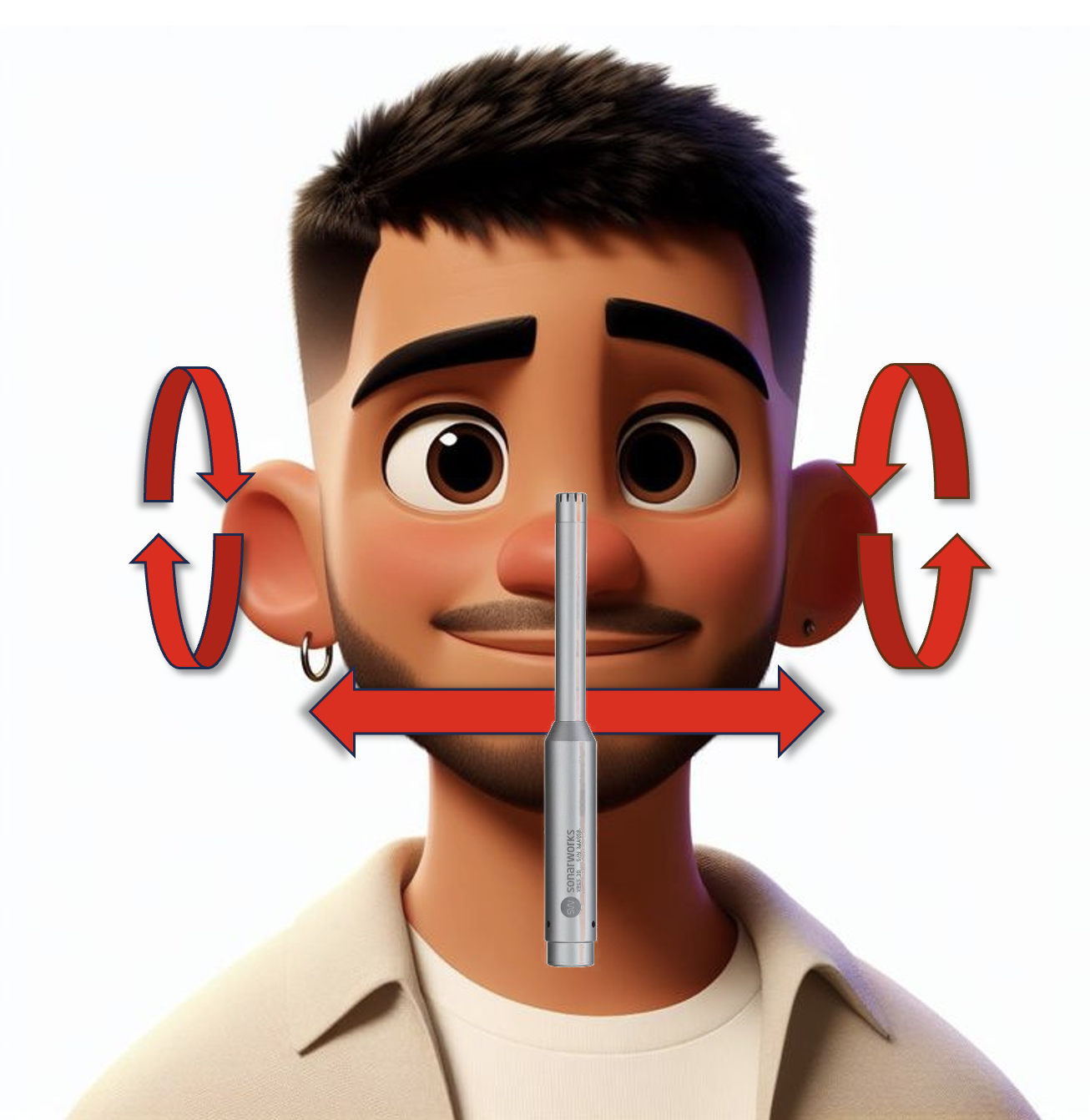 - начинаем перемещать микрофон в руке от одного уха к другому, у каждого уха делаем пару круговых движений вокруг уха (по оси ушных каналов) и затем перемещаемся к другому уху, делаем пару круговых движений вокруг уха, и опять возвращаемся к другому уху;