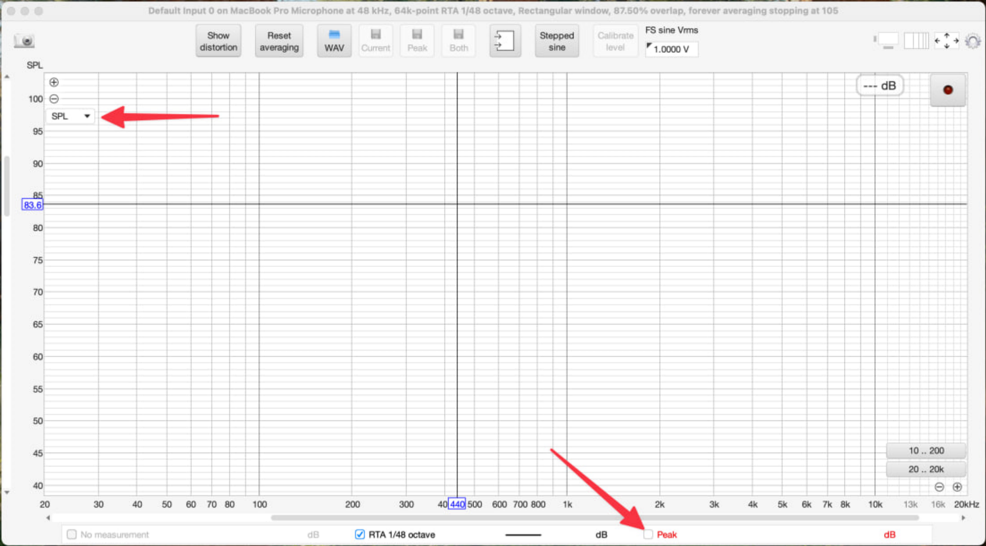 Проверяем что у нас в окне RTA шкала в SPL, а график пиковый значений "Peak" внизу окна отключен, он нам будет только мешать: