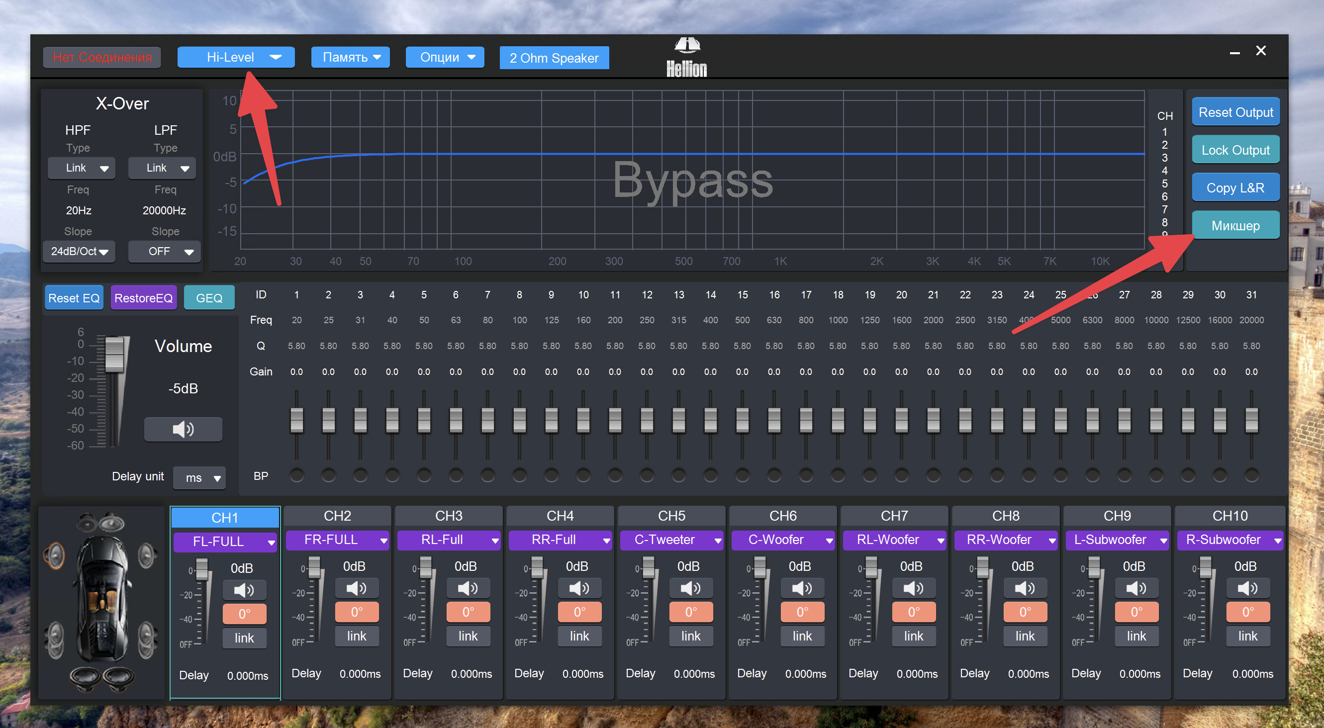 Запустив ПО для настройки процессора (в нашем случае для примера мы будем использовать Hellion HAM 8.10DSP), нам необходимо настроить источник для DSP и конфигурацию каналов входных и выходных.