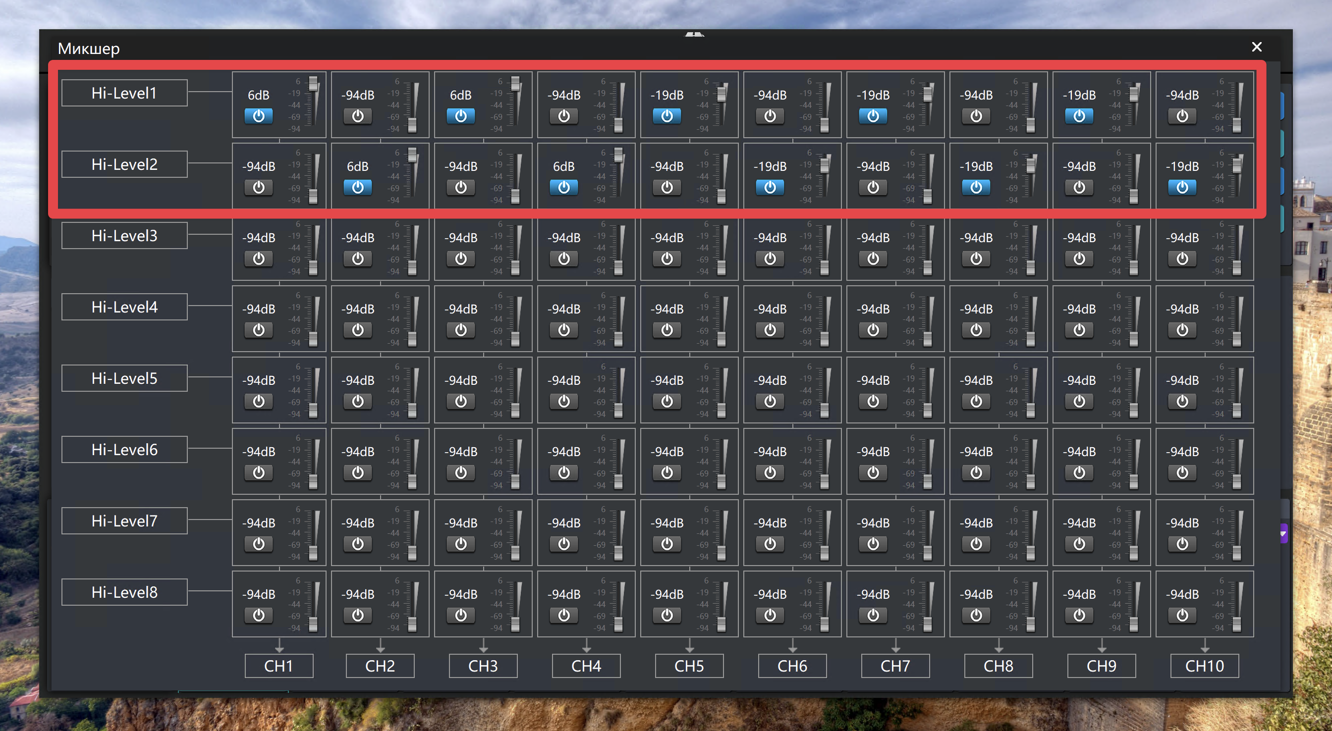 В данном примере мы направляем входной левый канал с ГУ Hi-Level1 во все нечетные каналы, которые мы назначим всем левым динамикам (CH1, CH3, CH5, и т.д.). А входной правый канал Hi-Level2 на все четные выходные каналы, которые мы назначим всем правым динамикам (CH2, CH4, CH6, и т.д.).