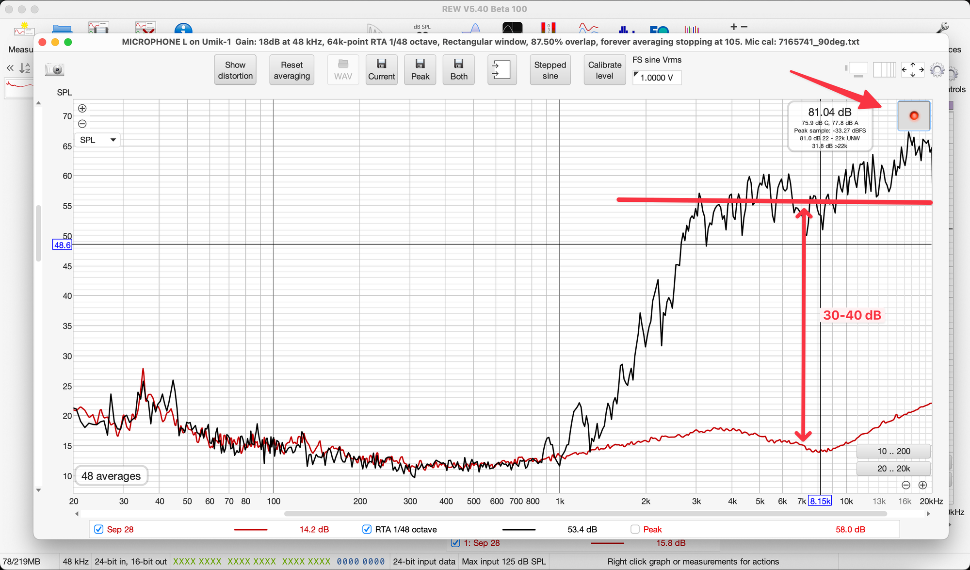 - нам требуется задать такой уровень громкости сигнала с ГУ, который будет на большей части частотного диапазона выше уровня шума (который мы замерили ранее) на 30-40 дБ. Обычно считается, что если мы будем применять кроссоверы 24 db/oct, то нам хватит и разницы и 25 дБ, но чаще происходит так, что в ходе эквализации нам надо снизить целевой уровень АЧХ динамика, и тогда шум уже будет мешать в работе при эквализации. Для себя я определил, что 30-40 дБ является удобным значением;