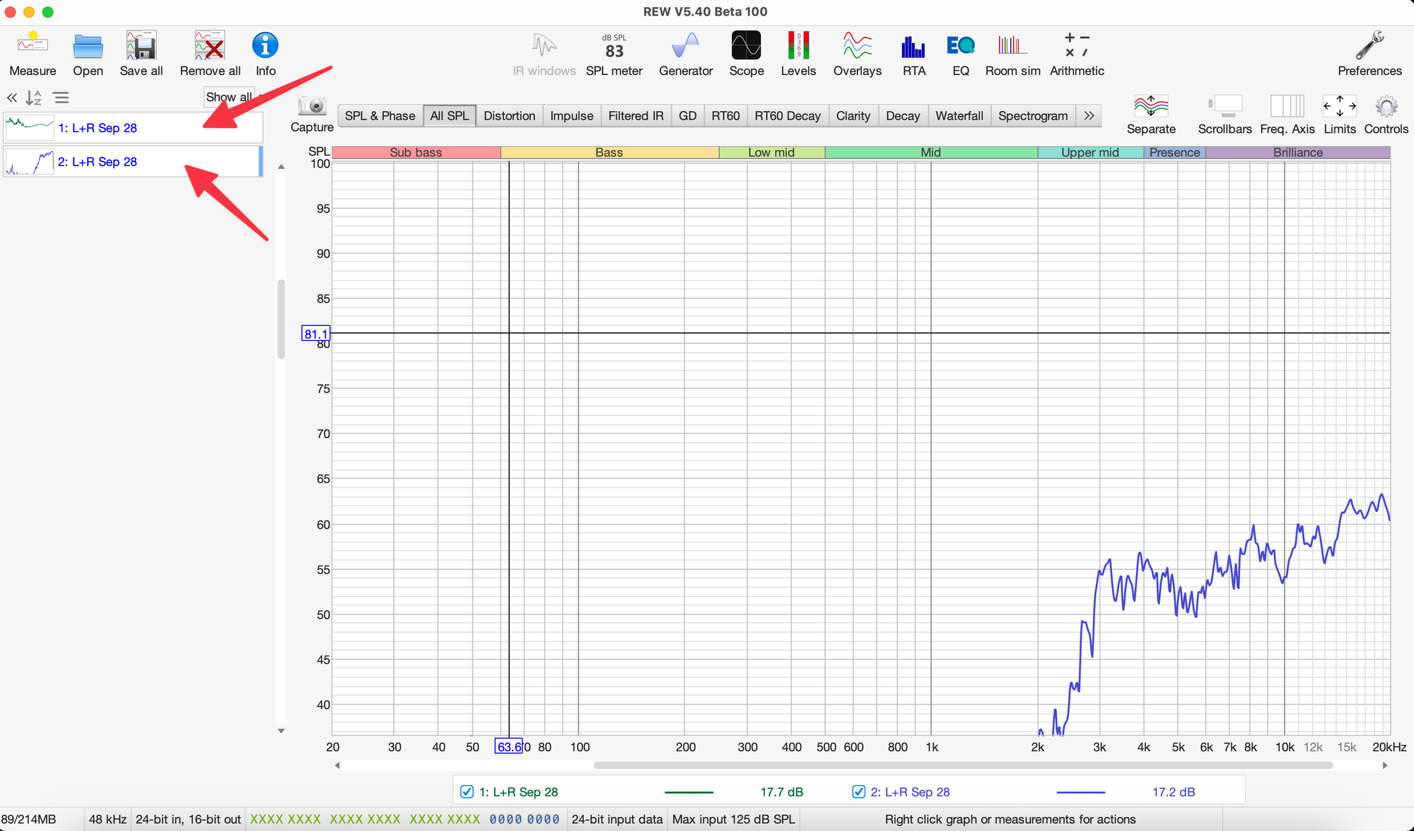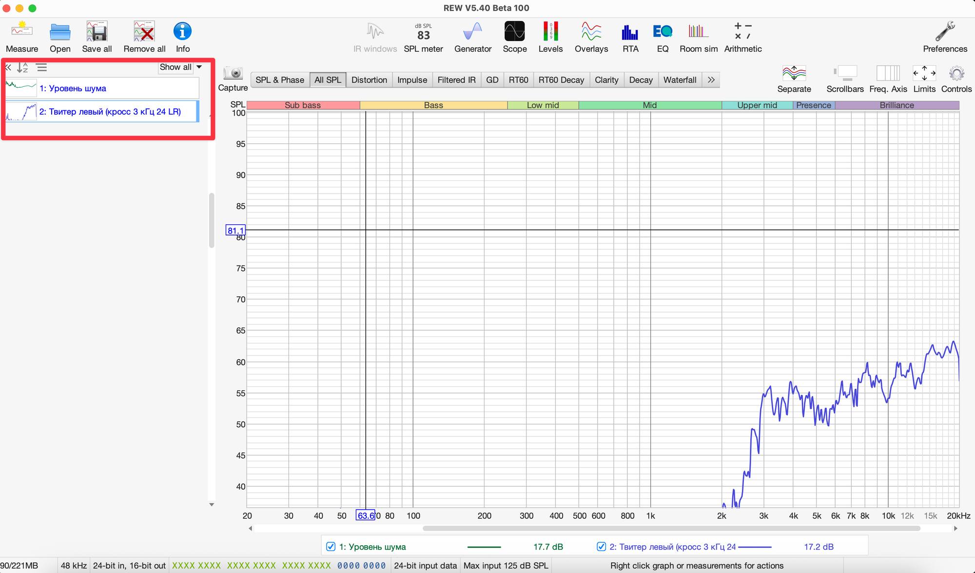 В ходе измерений меняем на следующий измеряемый канал, включаем его, остальные выключаем. Выполняем сначала замеры твитеров (начинаем с левого), затем мидбасов, потом сабвуфера.
