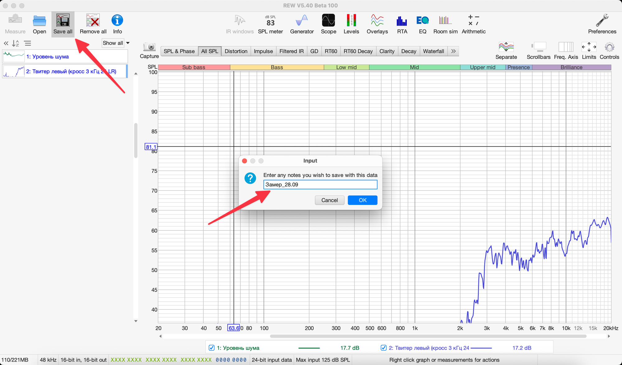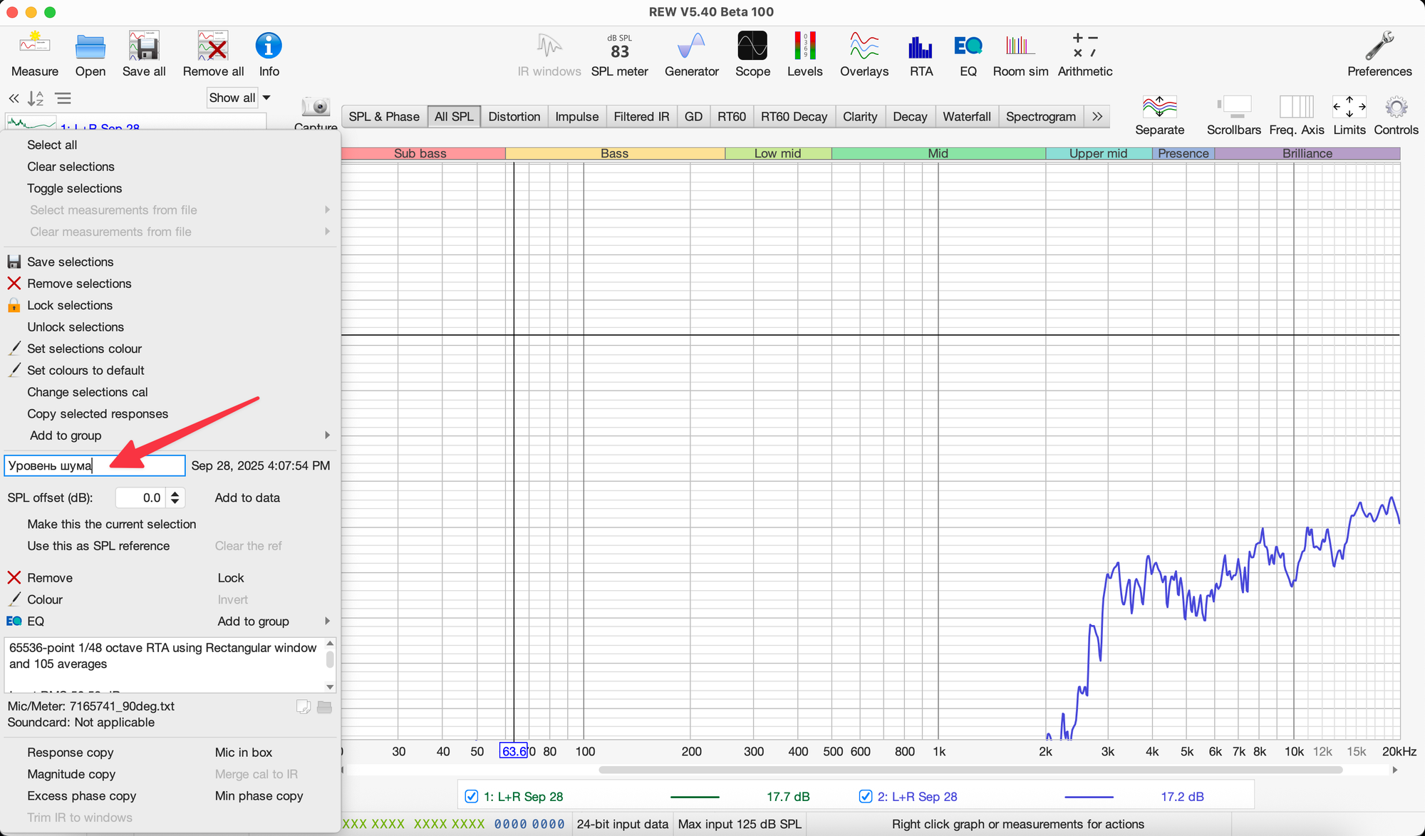 Я же обычно закрываю окно RTA, и иду переименовать сохраненный график, чтобы не запутаться. Например на скриншоте ниже у нас сохранено уже два графика: 1 - уровень шума с салоне (мы делали его замер ранее), 2 - график АЧХ левого твитера.